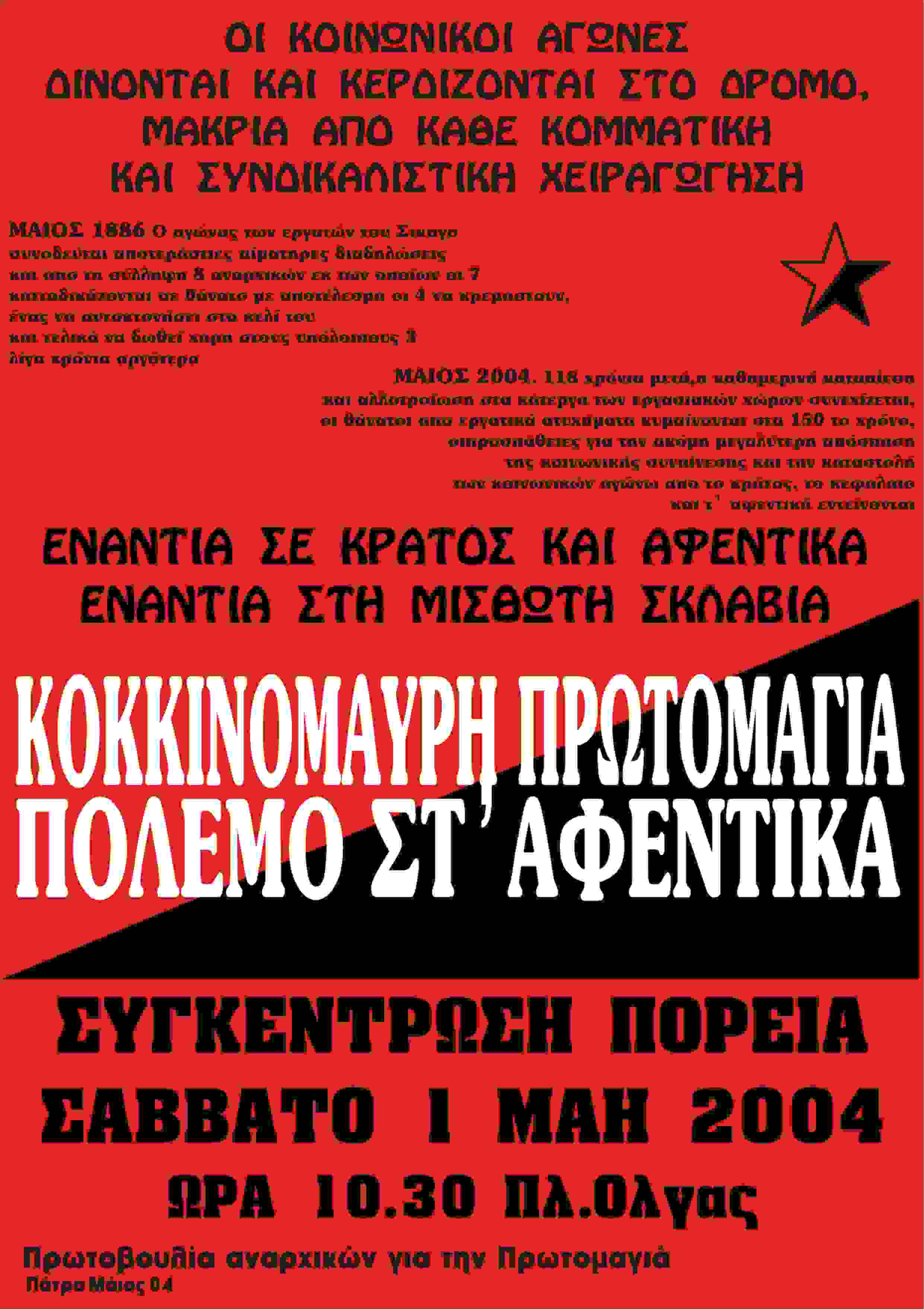 Κέιμενα και αφίσσα της “πρωτοβουλίας αναρχικών για την πρωτομαγιά” που καλούσε σε πορεία απο την πλατεία Όλγας. Share this: Click to share on Facebook (Opens in new window) Facebook Click to share on X (Opens in new window) X Like Loading... Related