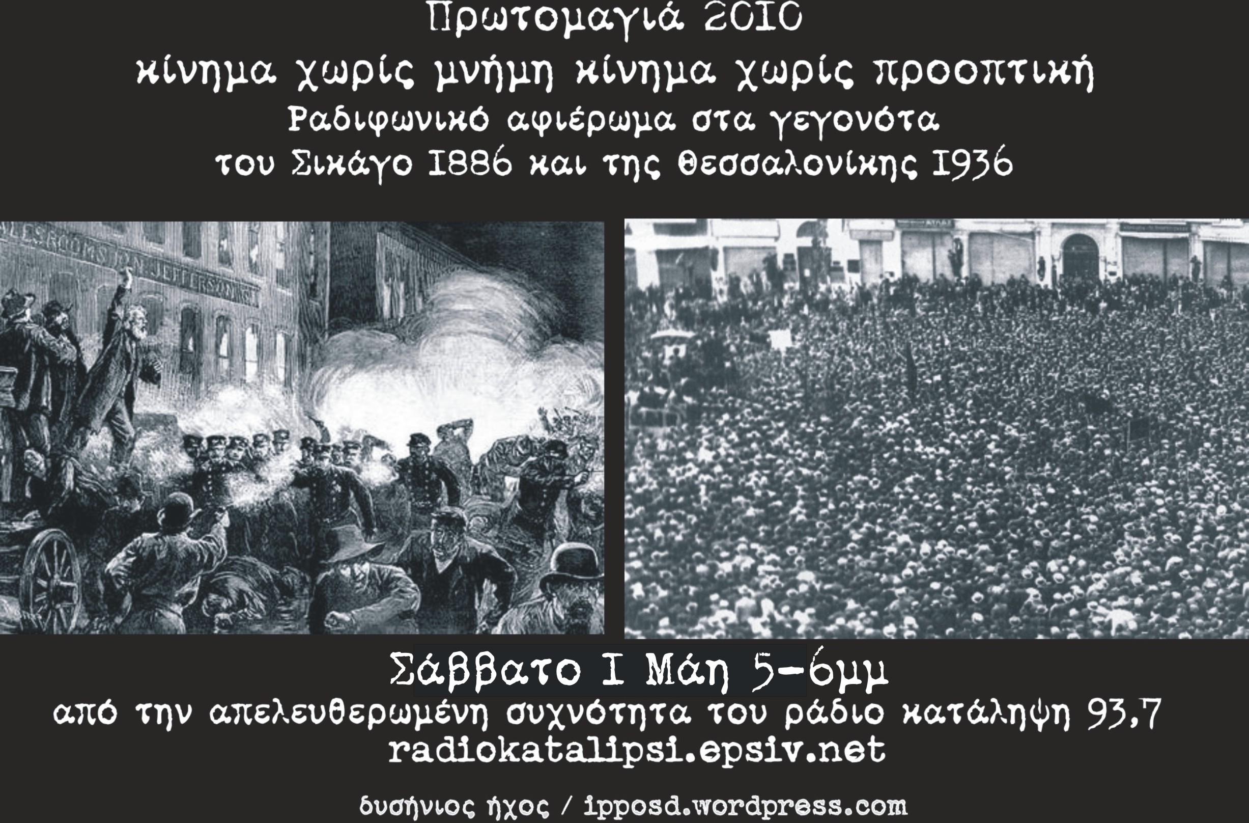 Θεματικό αφιέρωμα Σικάγο 1886 Θεσσαλονίκη 1936 Σάββατο 1 Mάη 5-6 από την απελευθερωμένη συχνότητα του radiokatalipsi 93,7 radiokatalipsi.espiv.net Share this: Click to share on Facebook (Opens in new window) Facebook Click to share on X (Opens in new window) X Like Loading... Related