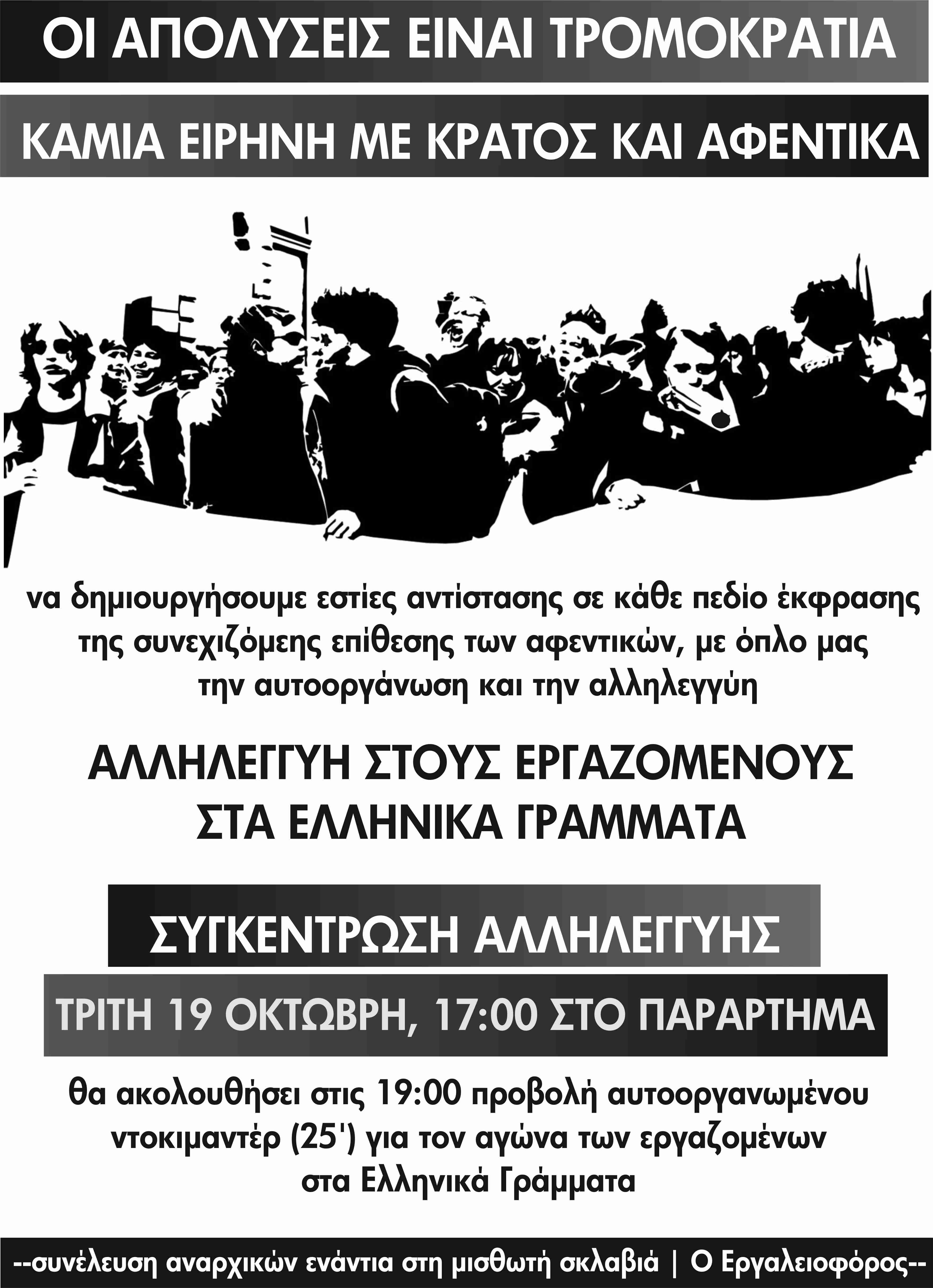 Η Συνέλευση Αναρχικών Ενάντια στη Μισθωτή σκλαβιά “Ο Εργαλειοφόρος” καλεί συγκέντρωση αλληλεγγύης στους εργαζομένους στον εκδοτικό οίκο “ελληνικά γράμματα” και ενάντια στην τρομοκρατία των απολύσεων.