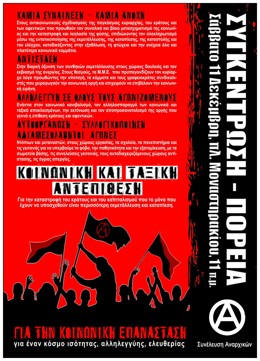 *Αφίσα της συνέλευσης αναρχικών από Αθήνα που καλεί σε πορεία στις 11 Δεκέμβρη για την κοινωνική και ταξική αντεπίθεση!