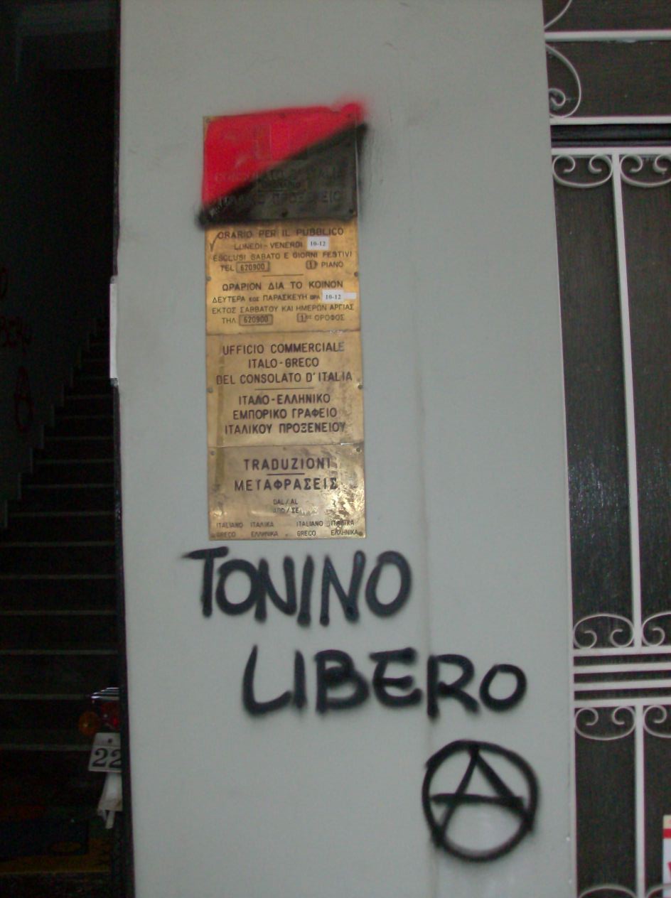 Στη Νάπολη της Ιταλίας, οι μπάτσοι επιτρέπουν σε μια ομάδα φασιστών να προσεγγίσει την ετήσια διαδήλωση της 1ης Μάη. Οι φασίστες ξεκινούν αμέσως να προκαλούν και να απειλούν. Οι διαδηλωτές απαντούν και τους εκδιώκουν. Ένας φασίστας βρίσκει καταφύγιο σε ένα μαγαζί, ξεσπάει καυγάς, και βγαίνει από το μαγαζί τραυματισμένος. Στις 26 Ιούλη συλλαμβάνονται δύο άτομα. Ένας εκ τον οποίον ο σύντροφος Τονίνο προφυλακίζεται στη φυλακή της Civitavecchia στη Ρώμη μέχρι τις 21 Δεκεμβρίου και έκτοτε βρίσκεται σε κατ’οίκον περιορισμό μέχρι τη δίκη στις 2 Φεβρουαρίου. Καταλαμβάνουμε σήμερα 28 Ιανουαρίου το ιταλικό προξενείο στην Πάτρα ως κίνηση αλληλεγγύης στον σύντροφο Τονίνο και σε κάθε αιχμάλωτο του παγκόσμιου κοινωνικού ταξικού πολέμου. Δεν μπαίνουμε σε καμία αμυντική λογική περί της αθωότητας ή της ενοχής κανενός εξεγερμένου με βάση το θεσμικό κρατικό δίκαιο. Δεν είμαστε δικηγόροι αλλά αναρχικοί. Και ακόμα περισσότερο θεωρούμε κάθε καταδίκη εις βάρος των συντρόφων μας σαν μία ανακοινωμένη καταδίκη απέναντι σε εμάς τους ίδιους, σαν προέκταση του διεθνώς διευρυμένου κοινωνικού-ταξικού πολέμου που δεχόμαστε σήμερα από τις προνομιούχες μειονότητες που συγκροτούν την εξουσία.