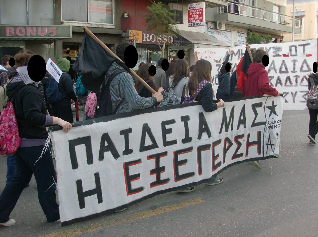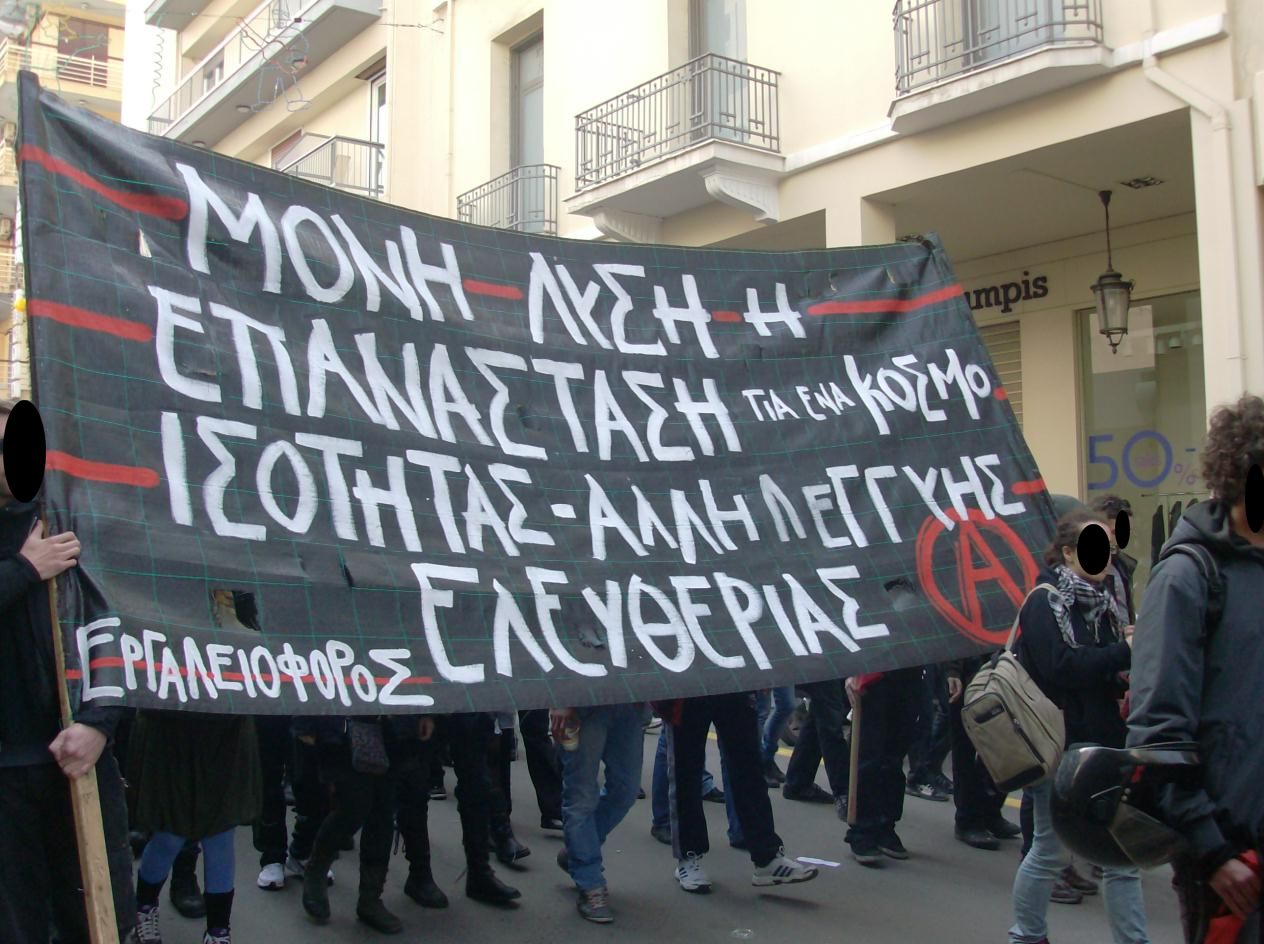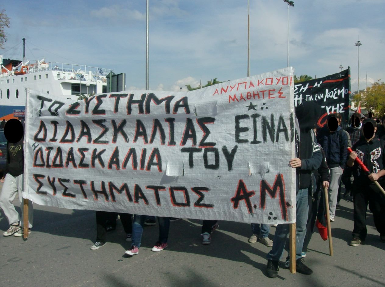 Στην πορεία σχηματίστηκαν 2 μπλοκ αναρχικών αντιεξουσιαστών, ένα από τον εργαλειοφόρο με περίπου 500 άτομα και ένα από την αυτόνομη συλλογικότητα των ανυπάκουων μαθητών/μαθητριών που αριθμούσε γύρω στα 50 άτομα. Χαρακτηριστικό είναι πως αρκετοί άνθρωποι επέλεξαν να κατέβουν με τα αντιεξουσιαστικά μπλοκ γυρίζοντας την πλάτη στους ξεπουλημένους εργατοπατέρες και στις αριστερές συνιστώσες του συστήματος.