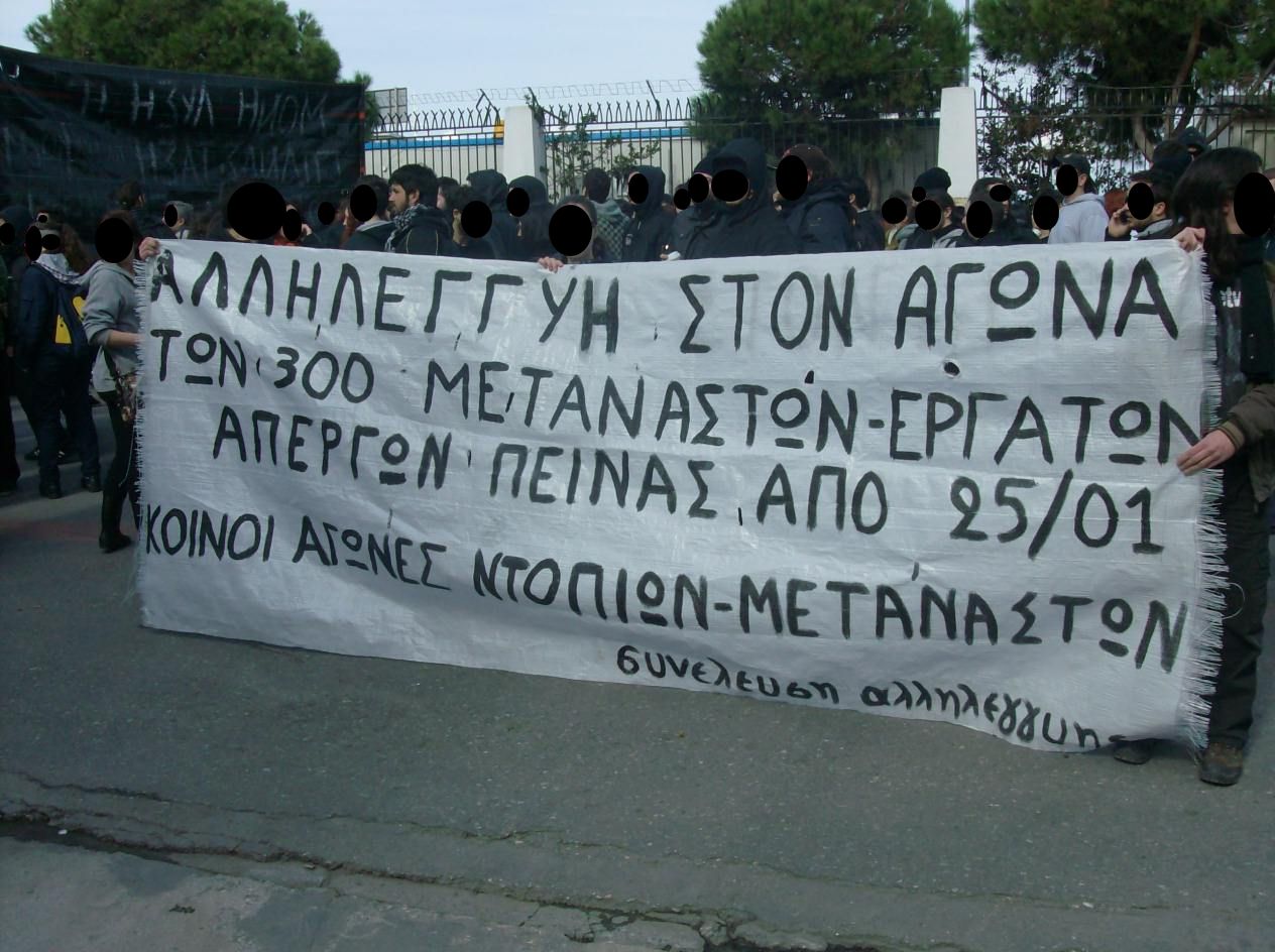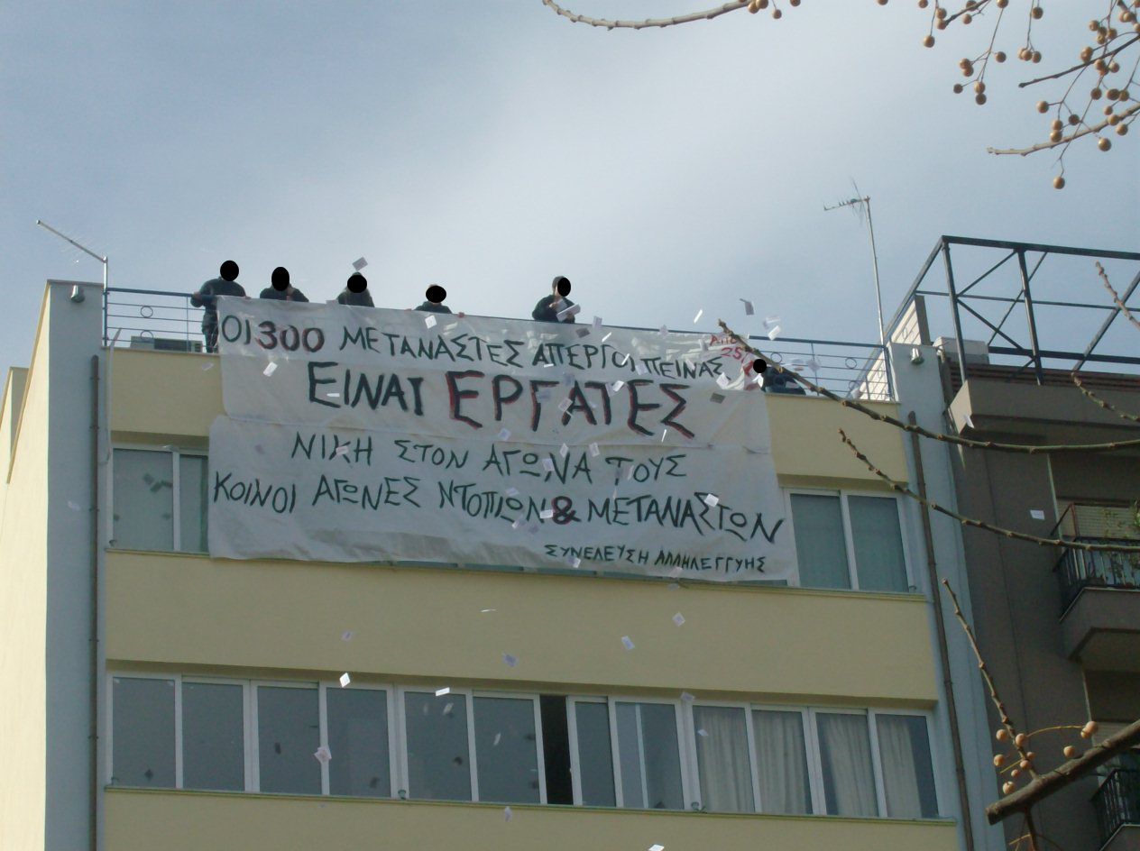 Επίσης, από τη συνέλευση αλληλεγγύης στους 300 μετανάστες-εργάτες απεργούς πείνας από 25 Γενάρη, κρεμάστηκε ένα μεγάλο πανό από την ταράτσα του εργατικού κέντρου που έγραφε: “οι 300 μετανάστες απεργοί πείνας είναι εργάτες – αλληλεγγύη στον αγώνα τους – κοινοί αγώνες ντόπιων και μεταναστών”.