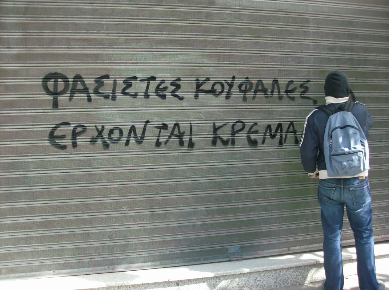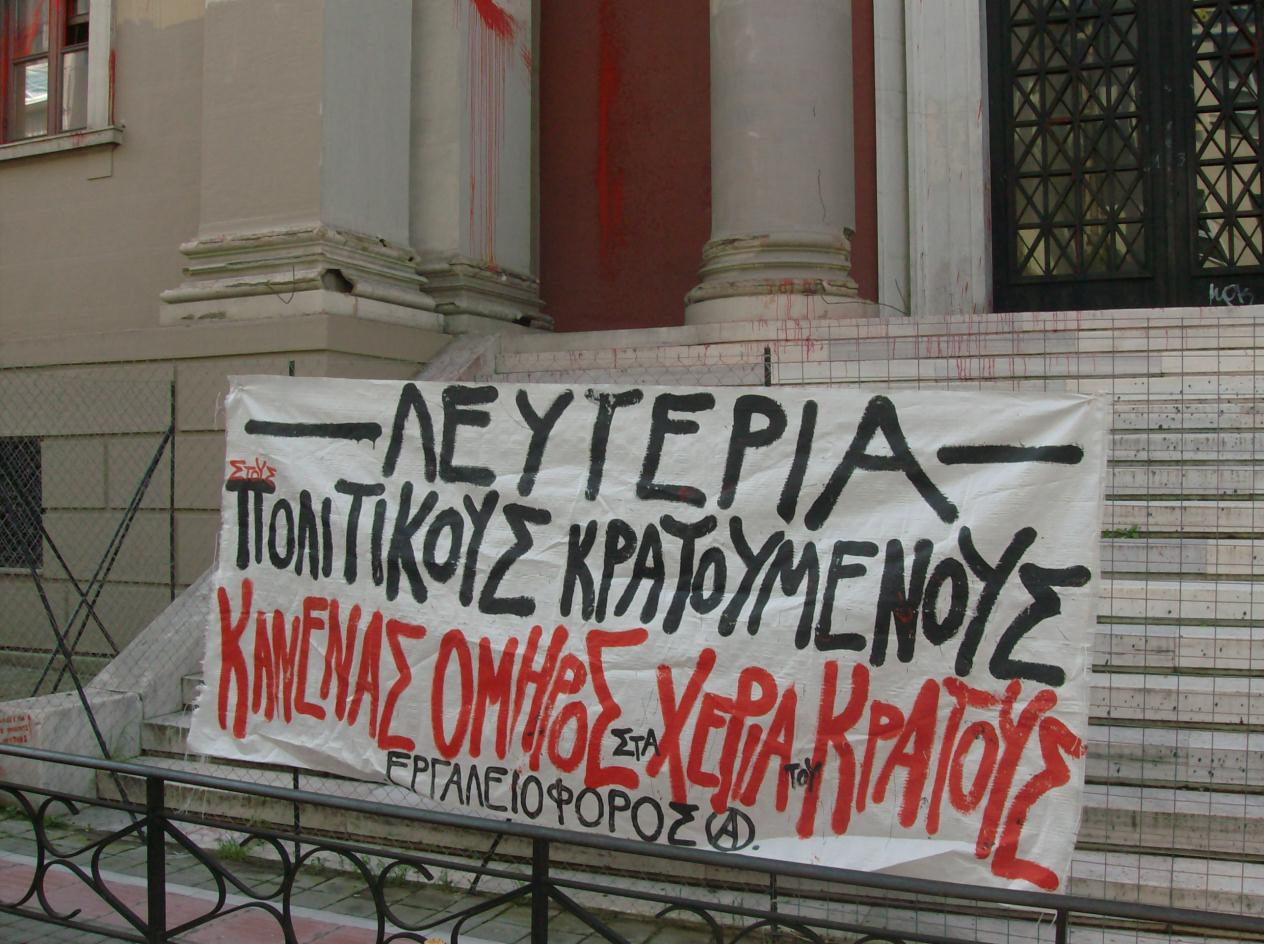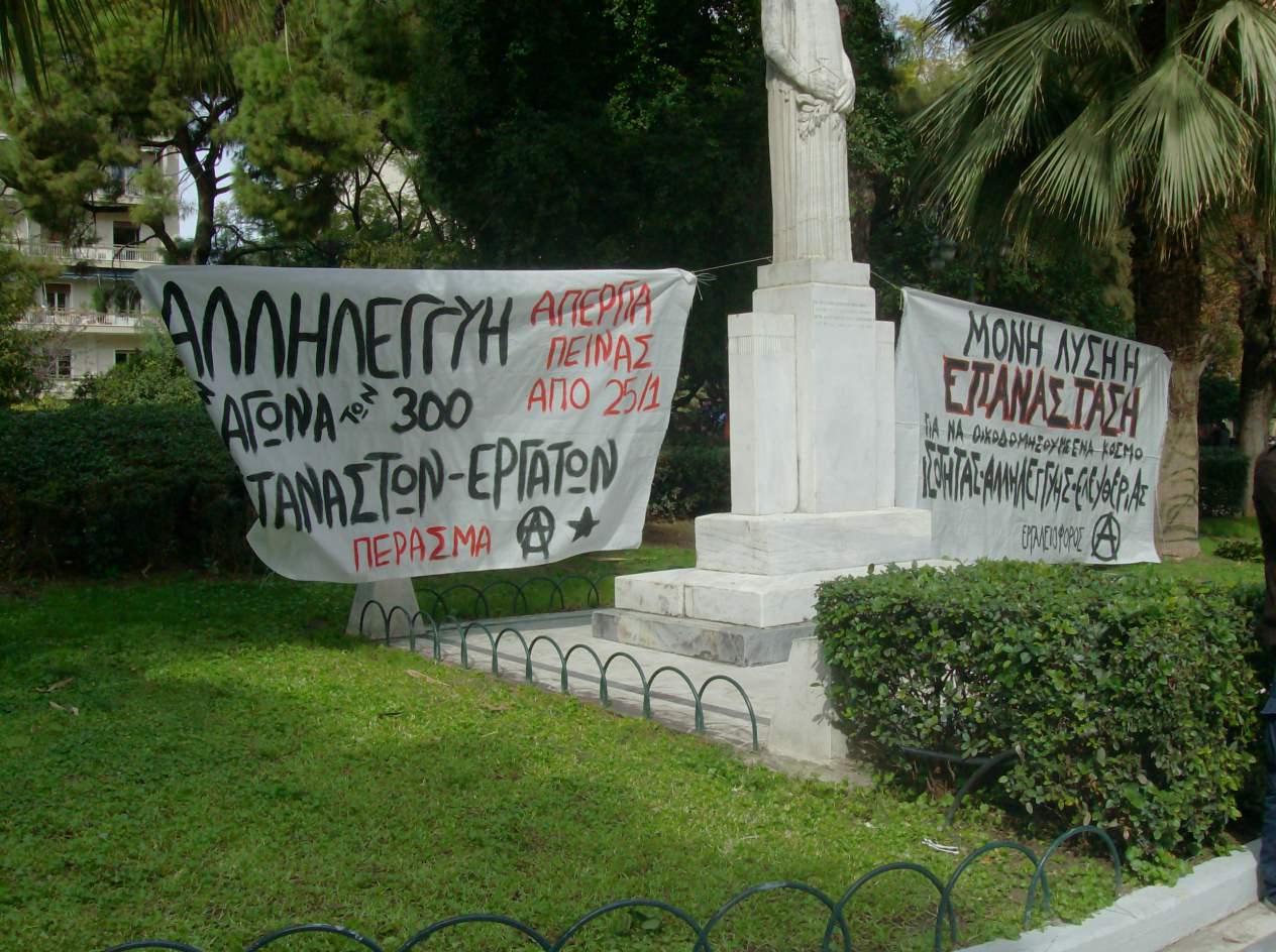 Στην πλ. Όλγας κρεμάστηκαν 2 πανό, ένα για τους απεργούς πείνας κι ένα που έλεγε “μόνη λύση η επανάσταση για να οικοδομήσουμε έναν κόσμο ισότητας, αλληλεγγύης κι ελευθερίας”