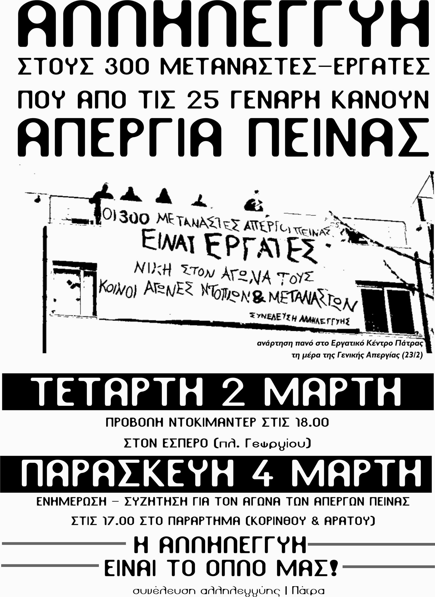 ΤΕΤΑΡΤΗ 2/3 στις 18.00 προβολή ντοκιμαντερ στον Εσπερο (πλ. Γεωργίου) ΠΑΡΑΣΚΕΥΗ 4/3 στις 17.00 ενημέρωση-συζήτητση για τον αγώνα των μεταναστών εργατών απεργών πείνας στο Παράρτημα (Κορίνθου κ Αράτου) Share this: Share on Facebook (Opens in new window) Facebook Share on X (Opens in new window) X Like Loading... Related