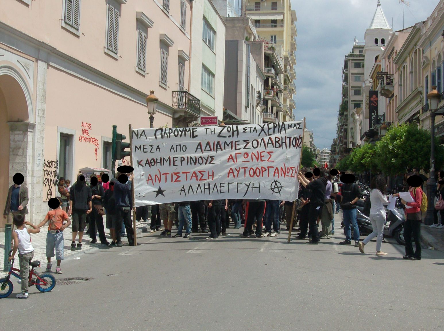 Η πορεία ξεκίνησε γύρω στις 12.15 και ακολούθησε το κλασικό δρομολόγιο (Ζαίμη-Μαιζώνος-Γούναρη-Κορίνθου), μοιράστηκαν πάρα πολλά κείμενα, γράφτηκαν πολλά συνθήματα στους τοίχους και πετάχτηκαν τρικάκια. Υπήρχε ένα πανό στην κεφαλή που έγραφε: “Να πάρουμε τη ζωή στα χέρια μας μέσα από αδιαμεσολάβητους καθημερινούς αγώνες — Αντίσταση-Αυτοοργάνωση-Αλληλεγγύη” και στο πίσω μέρος άλλο ένα που έγραφε: “όποιος δε μοιραστεί τον αγώνα θα μοιραστεί την ήττα”. Επίσης στην πορεία συμμετείχε και η πολιτική συνέλευση του στεκιού alphaville με δικό της πανό. Αρκετά μέτρα πιο πίσω ακολουθούσε μια διμοιρία ΜΑΤ και αρκετές μηχανές δι.ας.