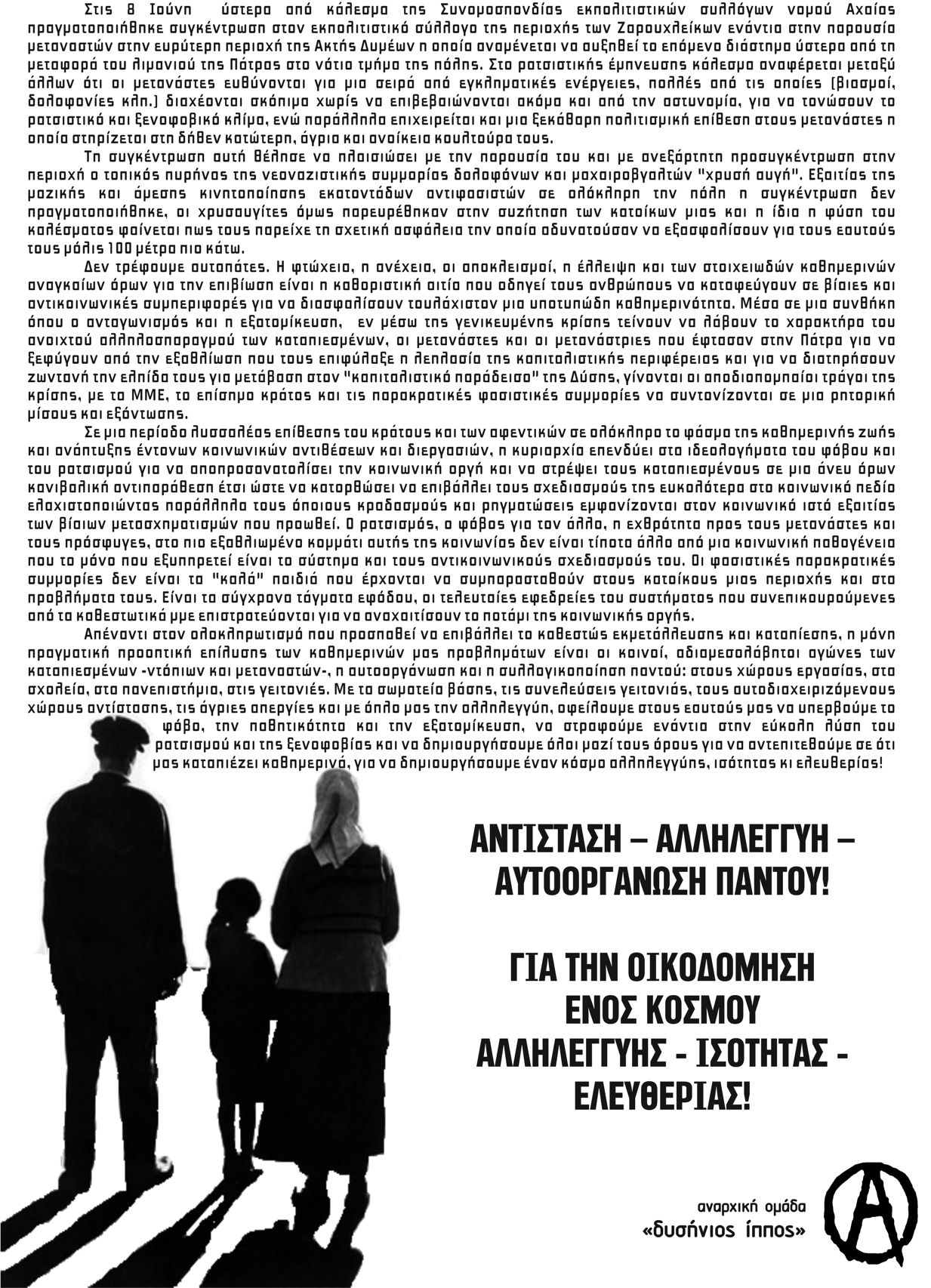 Το Σάββατο 25 Ιούνη το πρωί περίπου 50 σύντροφοι και συντρόφισσες πραγματοποίησαν μηχανικίνητη πορέια στην περιοχή των Ζαρουχλεϊκων στην Πάτρα, σε ένδειξη αλληλεγγύης στους μετανάστες και ενάντια στις ρατσιστικές αντιλήψεις, τον κοινωνικό κανιβαλισμό και τις φασιστικές-παρακρατικές συμμορίες. Μετά το τέλος της πορείας στην οποία συμμετείχαν περίπου 15 μηχανές και 7-8 αυτοκίνητα και διέσχισε πολύ μεγάλο τμήμα των νότιων γειτονιών της Πάτρας, ακολούθησε μικροφωνική στην πλατεία που βρίσκεται στη συμβολή των οδων Ευβοίας και Ανθείας. Σε όλη την παρέμβαση μοιράστηκαν πάρα πολλά κείμενα και πετάχτηκαν πολλές χιλιάδες τρικάκια. Η όλη κίνηση έληξε μετά τις 14.30 το μεσημέρι.