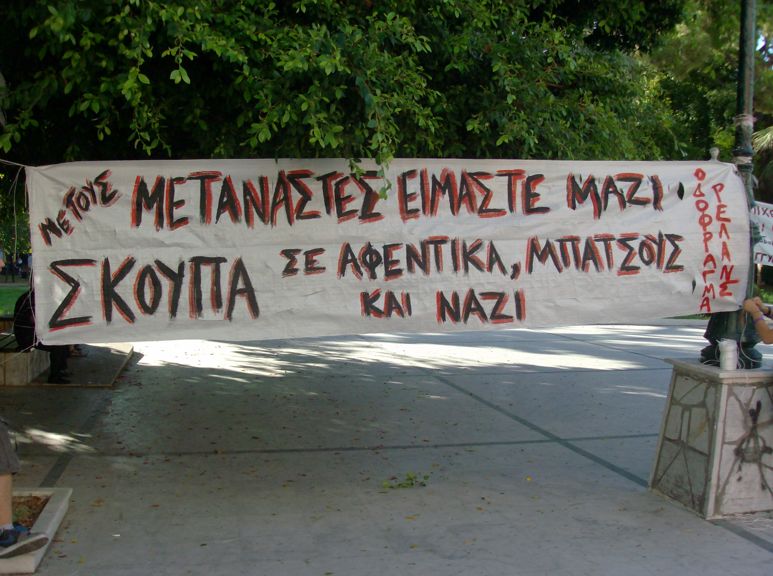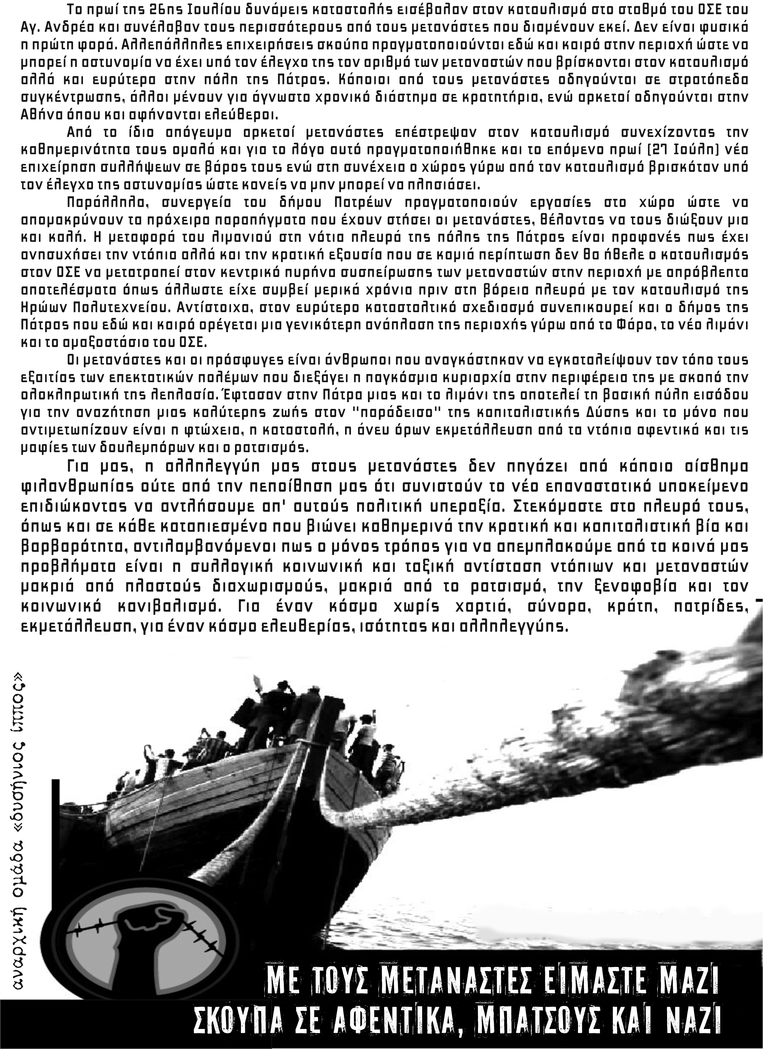 Την Πέμπτη 28 Ιούλη το απόγευμα πραγματοποιήθηκε στην πλατεία Όλγας, ύστερα από πρωτοβουλία συντρόφων, συγκέντρωση αλληλεγγύης στους μετανάστες και ενάντια στις επιχειρήσεις σκούπα που πραγματοποιούνται τις τελευαίες μέρες από τους μπάτσους σε συνεργασία με το δήμο Πατρέων στην περιοχή του καταυλισμού του ΟΣΕ στον Αγ. Ανδρέα.