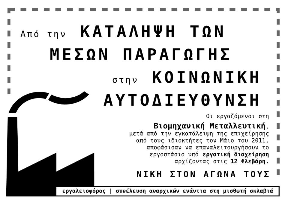 Οι εργαζόμενοι στη Βιομηχανική Μεταλλευτική μετά από την εγκατάλειψη της επιχείρησης από τους ιδιοκτήτες τον Μάιο του 2011 αποφάσισαν να επαναλειτουργήσουν το εργοστάσιο υπό εργατική διαχείριση αρχίζοντας στις 12 Φλεβάρη.