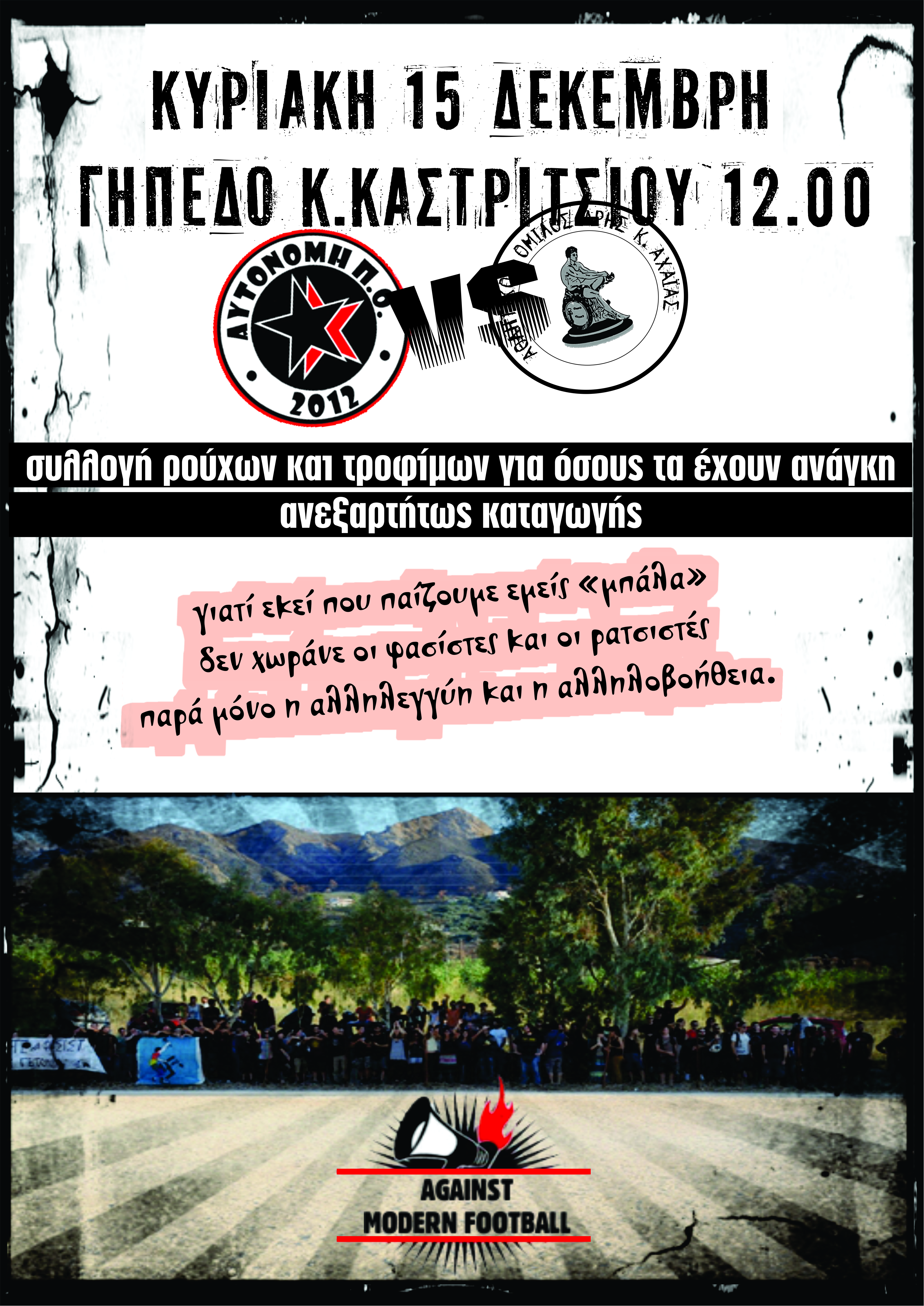 Γιατί εκεί που παίζουμε εμείς “μπάλα”, δεν χωράνε οι φασίστες και οι ρατσιστές παρά μόνο η αλληλεγγύη και η αλληλοβοήθεια. http://aftonomipo.wordpress.com/ Share this: Click to share on Facebook (Opens in new window) Facebook Click to share on X (Opens in new window) X Like Loading... Related