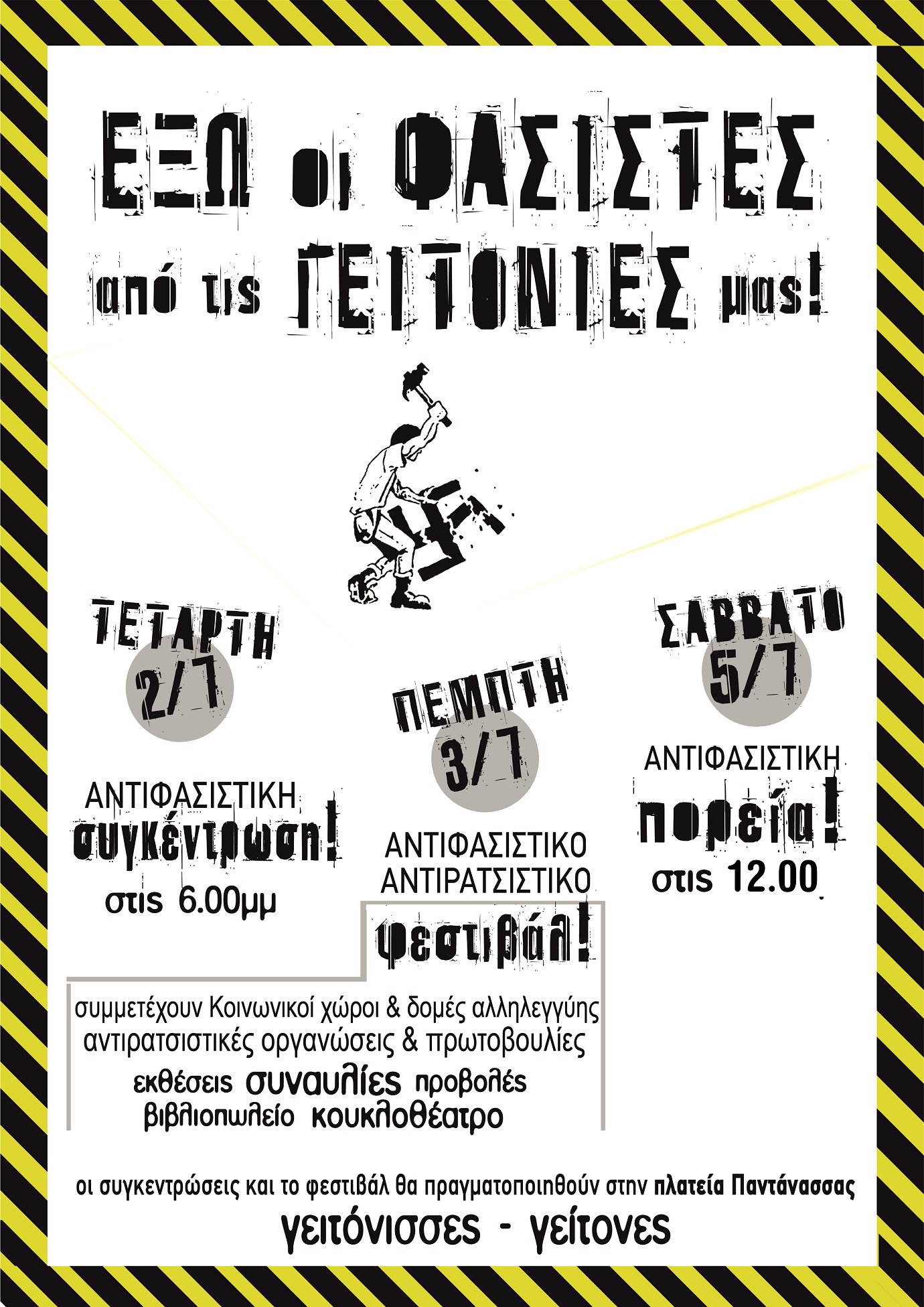 ΕΞΩ ΟΙ ΦΑΣΙΣΤΕΣ ΑΠΟ ΤΙΣ ΓΕΙΤΟΝΙΕΣ ΜΑΣ ΤΕΤΑΡΤΗ 2 ΙΟΥΛΗ ΑΝΤΙΦΑΣΙΣΤΙΚΗ ΣΥΓΚΕΝΤΡΩΣΗ ΣΤΙΣ 6 μ.μ. ΠΕΜΠΤΗ 3 ΙΟΥΛΗ ΑΝΤΙΦΑΣΙΣΤΙΚΟ – ΑΝΤΙΡΑΤΣΙΣΤΙΚΟ ΦΕΣΤΙΒΑΛ ΣΑΒΒΑΤΟ 5 ΙΟΥΛΗ ΑΝΤΙΦΑΣΙΣΤΙΚΗ ΠΟΡΕΙΑ ΣΤΙΣ 12 μ. από την πλατεία της Παντάνασσας γείτονες – γειτόνισσες Share this: Click to share on Facebook (Opens in new window) Facebook Click to share on X (Opens in new window) X Like Loading... Related