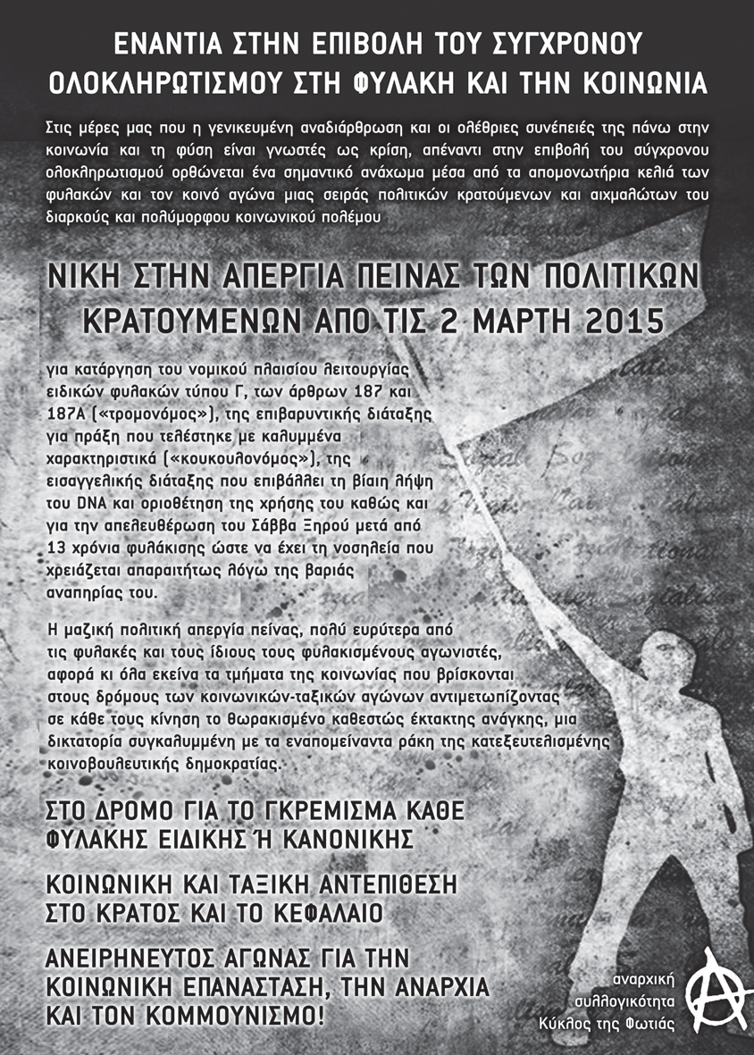 Στις μέρες μας που η γενικευμένη αναδιάρθρωση και οι ολέθριες συνέπειές της πάνω στην κοινωνία και τη φύση είναι γνωστές ως κρίση, απέναντι στην επιβολή του σύγχρονου ολοκληρωτισμού -έννοια που βρίσκεται πια στον ορίζοντα της σκέψης κάθε αγωνιζόμενου ανθρώπου από τα κάτω- ορθώνεται ένα σημαντικό ανάχωμα μέσα από τα απομονωτήρια κελιά των φυλακών και τον κοινό αγώνα μιας σειράς πολιτικών κρατούμενων και αιχμαλώτων του διαρκούς και πολύμορφου κοινωνικού πολέμου: η απεργία πείνας για α) κατάργηση του νομικού πλαισίου λειτουργίας ειδικών φυλακών τύπου Γ, β) κατάργηση των άρθρων 187 και 187Α («τρομονόμος»), γ) κατάργηση της επιβαρυντικής διάταξης για πράξη που τελέστηκε με καλυμμένα χαρακτηριστικά («κουκουλονόμος»), δ) κατάργηση της εισαγγελικής διάταξης που επιβάλλει τη βίαιη λήψη του DNA και οριοθέτηση της χρήσης του, και ε) απελευθέρωση του Σάββα Ξηρού μετά από 13 χρόνια φυλάκισης ώστε να έχει τη νοσηλεία που χρειάζεται απαραιτήτως λόγω της βαριάς αναπηρίας του.