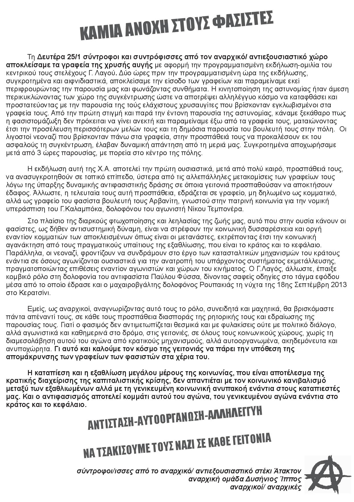Πάτρα- Ενημέρωση για τον αποκλεισμό των γραφείων της Χ.Α. στις 25/1 και μοίρασμα κειμένων στην περιοxή