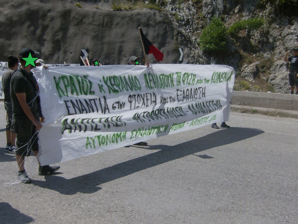 Σε μια εποχή που η κρατική και καπιταλιστική βαρβαρότητα επιχειρεί να διαλύσει τις ζωές των εργατών, των ανέργων, των φτωχών και πληβείων της κοινωνίας, σε μια εποχή που καμία κυβέρνηση, κόμμα, κοινοβούλιο και διαμεσολαβητικός μηχανισμός δεν μπορούν να υποσχεθούν παρά μόνο υποταγή και εξαθλίωση, θέλουμε και πρέπει να αναπτύξουμε σε κάθε κοινωνικό χώρο, στις πόλεις και τα χωριά, στους χώρους εκμετάλλευσης, στις γειτονιές, στα σχολεία και τις σχολές, αυτοοργανωμένες δομές αγώνα και αλληλεγγύης και να κρατήσουμε ανοιχτά τα μονοπάτια του αγώνα για την προάσπιση του φυσικού κόσμου.