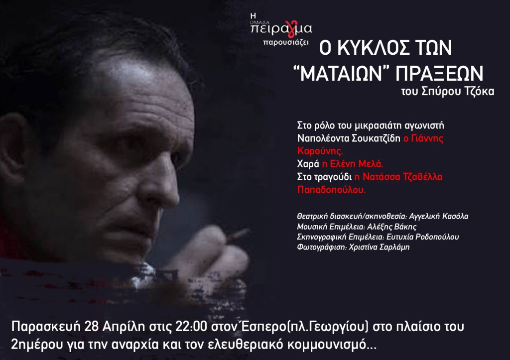 Την Παρασκευή 28 Απρίλη στις 22.00μ.μ. στον Έσπερο(πλ.Γεωργίου) στο πλαίσιο του 2ημέρου για την αναρχία και τον ελευθεριακό κομμουνισμό
