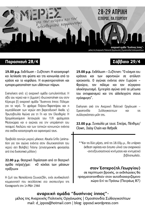 Promo βιντεο για τις 2 μερες για την αναρχία και τον ελευθεριακό κομμουνισμό εδώ.