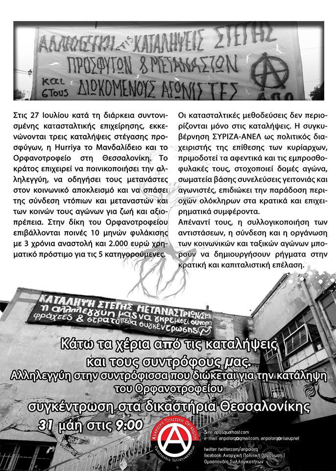 Στις 27 Ιουλίου κατά τη διάρκεια συντονισμένης κατασταλτικής επιχείρησης, εκκενώνονται τρεις καταλήψεις στέγασης προσφύγων, η Hurriya το Μανδαλίδειο και το Ορφανοτροφείο στη Θεσσαλονίκη.