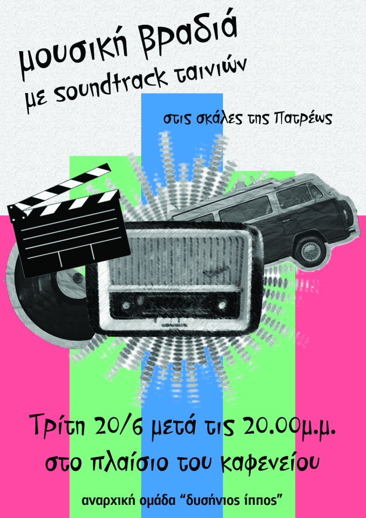 μουσική βραδιά με soundtrack ταινιών στις σκάλες της Πατρέως Τρίτη 20/6 μετά τις 20.00μ.μ. στο πλαίσιο του καφενείου Share this: Click to share on Facebook (Opens in new window) Facebook Click to share on X (Opens in new window) X Like Loading... Related