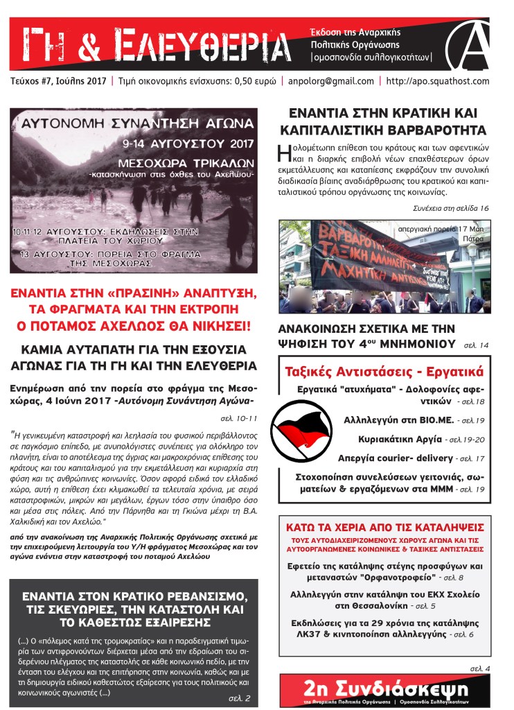 Κυκλοφόρησε το 7ο τεύχος του εντύπου της Αναρχικής Πολιτικής Οργάνωσης “Γη και Ελευθερία”. Θα το βρείτε σε αυτοδιαχειριζόμενους χώρους, στέκια και καταλήψεις, καθώς και στους δρόμους του αγώνα. Κατεβάστε το από εδώ σε μορφή pdf