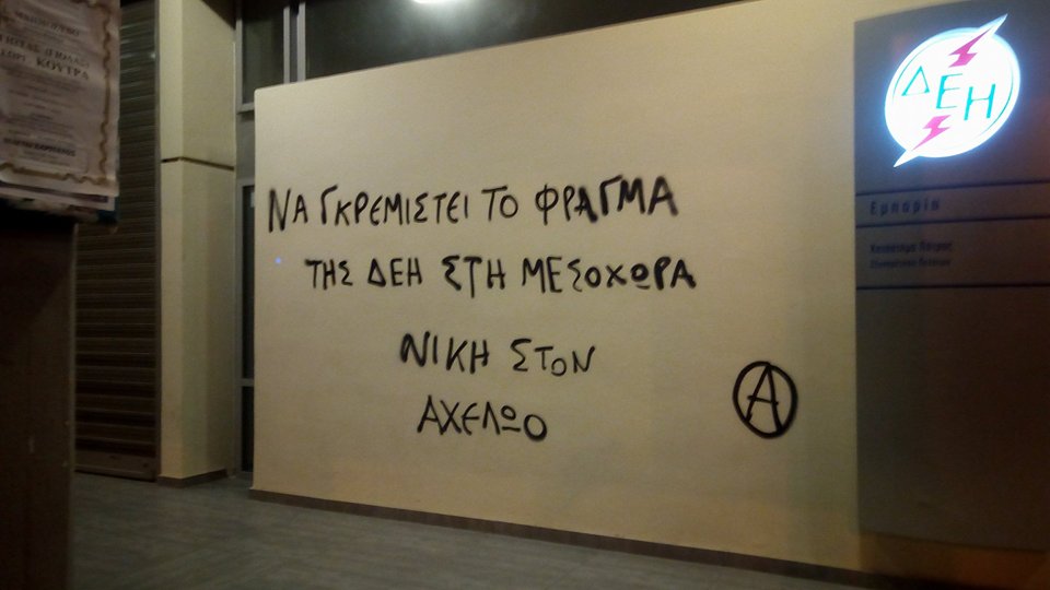 Παρέμβαση με μπογιές στο κεντρικό κτίριο της ΔΕΗ στην Πάτρα. Ενάντια στα φράγματα και την εκτροπή του ποταμού Αχελώου