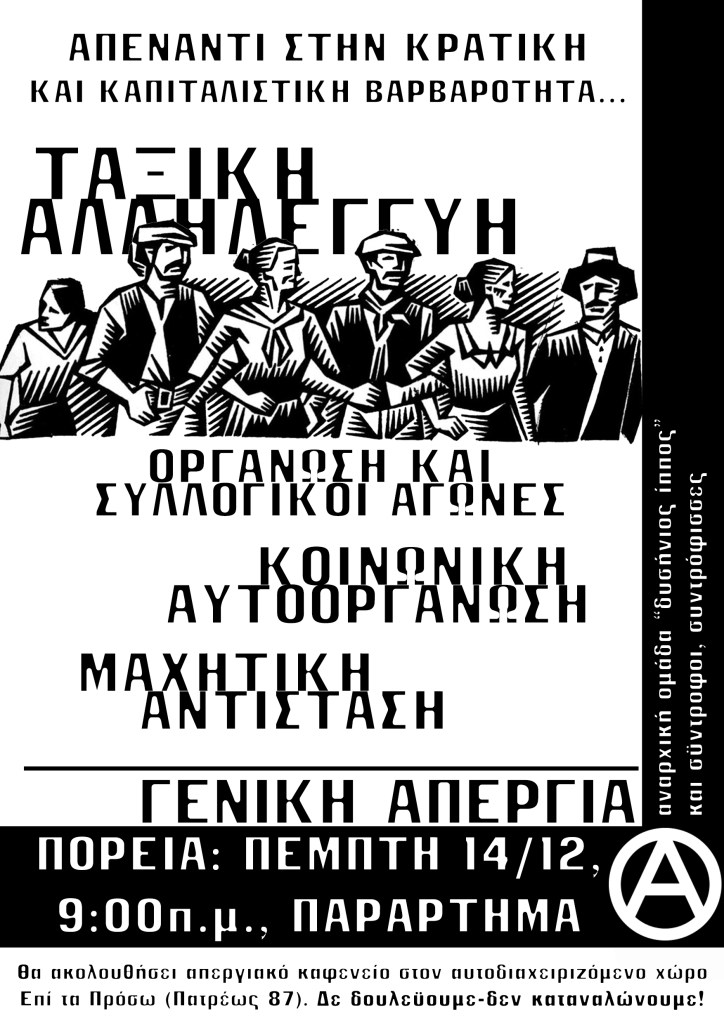 Απέναντι στη βίαιη υποτίμηση της ζωής μας, όλοι εμείς οι από κάτω αυτού του κόσμου, οι εργαζόμενοι, οι άνεργοι, οι νεολαίοι, ντόπιοι και μετανάστες, γνωρίζοντας τις πραγματικές μας ανάγκες, οφείλουμε να πάρουμε τη ζωή στα χέρια μας, να οργανωθούμε και να αγωνιστούμε, συλλογικά, αυτοοργανωμένα και αδιαμεσολάβητα, σε κάθε κοινωνικό και εργασιακό χώρο, στα σχολεία και τις σχολές, στους χώρους δουλειάς, στις γειτονιές και στους δρόμους, μακριά από οποιαδήποτε κομματική και συνδικαλιστική χειραγώγηση που αναπόφευκτα οδηγεί στην αποδυνάμωση και στον εκφυλισμό του κοινωνικού και ταξικού κινήματος. Με σωματεία βάσης, συνελεύσεις γειτονιάς και αγωνιστικά σχήματα των νεολαίων, των μαθητών, των φοιτητών και των εργατών να στήσουμε αναχώματα στην κρατική και καπιταλιστική επίθεση που γιγαντώνεται.
