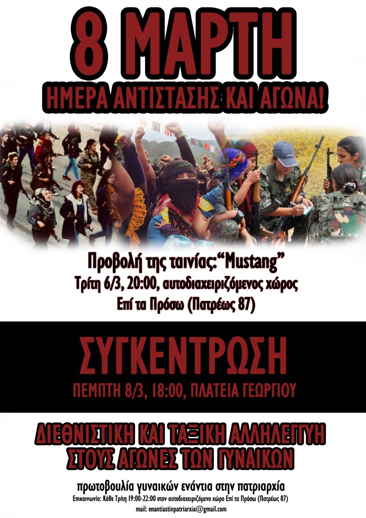Μαθαίνουμε και αντλούμε έμπνευση από τους αγώνες των γυναικών σε όλο τον κόσμο, από τις γυναίκες Ζαπατίστας που αυτές τις μέρες οργανώνουν τhn «1η διεθνή πολιτική, καλλιτεχνική, αθλητική και πολιτιστική συνάντηση γυναικών που αγωνίζονται», από τις τουρκάλες συντρόφισσες, από τις αντάρτισσες στο Κομπάνι και το Αφρίν που υπερασπίζονται τους τόπο τους απέναντι στην τούρκικη φασιστική εισβολή και στη τζιχαντιστική τρομοκρατία και από όσες αντιστέκονται στον σύγχρονο ολοκληρωτισμό σε όλα τα μήκη και τα πλάτη του πλανήτη. Συνεχίζουμε τον αγώνα για τη γυναικεία χειραφέτηση, τον αγώνα για την ελευθερία όλων κόντρα σε κάθε σχέση εξουσίας που μας επιβάλλεται.