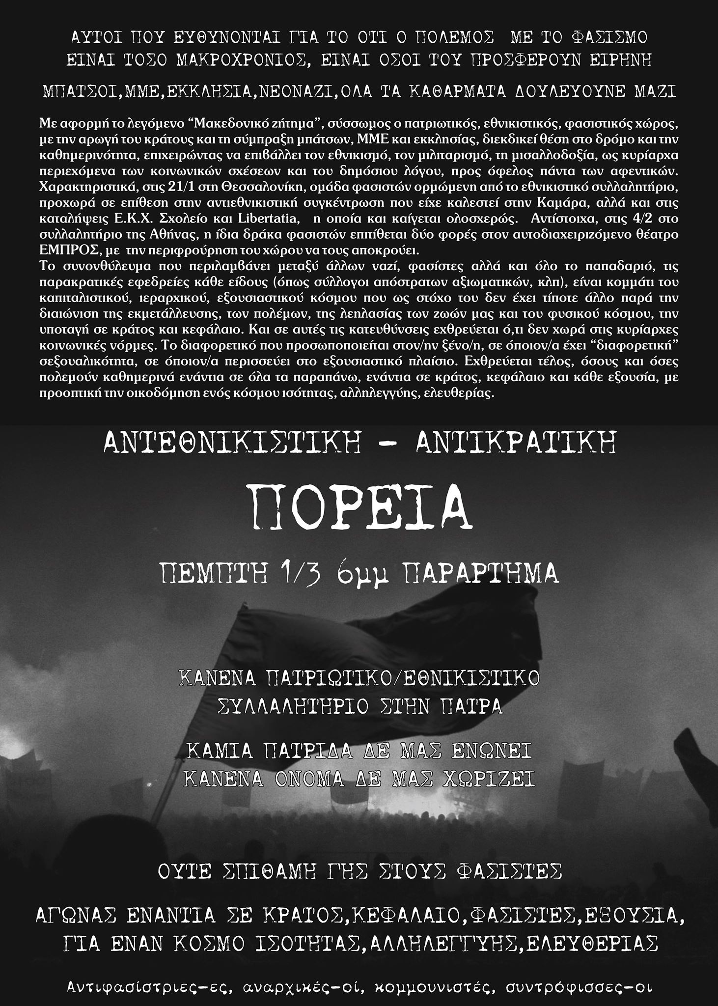Αντιεθνικιστική-Αντικρατική πορεία, Πέμπτη 1/3, 6 μ.μ., Παράρτημα
