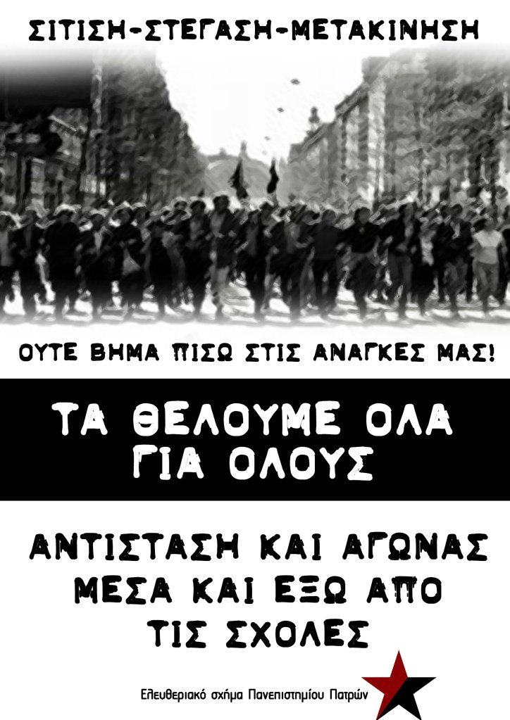 Η επίθεση που δεχόμαστε καθημερινά από το κράτος και τους διάφορους αιμοδιψείς ιδιώτες μέσα στο πανεπιστήμιο προεικονίζει την ζοφερή πραγματικότητα που προετοιμάζουν οι κυρίαρχοι για μας τους φοιτητές, τους άνεργους, τους μετανάστες και τους εργαζόμενους. Μέσα σε αυτή τη ζοφερή πραγματικότητα όμως υπάρχουν και οι αντιστάσεις που αναπτύσσονται οι οποίες αποτελούν πηγή έμπνευσης και μας πεισμώνουν ακόμα περισσότερο. Πρόκειται για εκείνες τις μικρές αλλά σημαντικές φοιτητικές ταξικές αρνήσεις που αναπτύσσονται στην πανεπιστημιακή καθημερινότητα. Αρνήσεις οι οποίες ταράσσουν τα ήρεμα νερά της ‘’πανεπιστημιακής ομαλότητας’’. Μέσα από τους αυτοοργανωμένους αγώνες που στελεχώνονται δίχως κάποια καθοδήγηση και επίδειξη από κάποια πεφωτισμένη πρωτοπορία. Μέσα από την άμεση ενεργοποίηση των ταξικών αντανακλαστικών των φοιτητών, βλέπουμε να ξεπηδούν διάφορες εστίες αμφισβήτησης, αντίστασης και αγώνα στον χώρο του πανεπιστημίου. Νικηφόροι αγώνες όπως η κατάληψη του ΙΝΕΔΙΒΙΜ στην Αθήνα αλλά και το άνοιγμα του εστιατορίου της φοιτητικής εστίας στην Πάτρα για την επαναφορά της ελεύθερης εισόδου κατά το πρωινό γεύμα, επιβεβαιώνουν ότι η πίστη, η οργάνωση και το δόσιμο στον αγώνα είναι υπαρκτές και αναγκαίες συνθήκες για να είναι οι αγώνες μας διεξοδικοί και νικηφόροι.