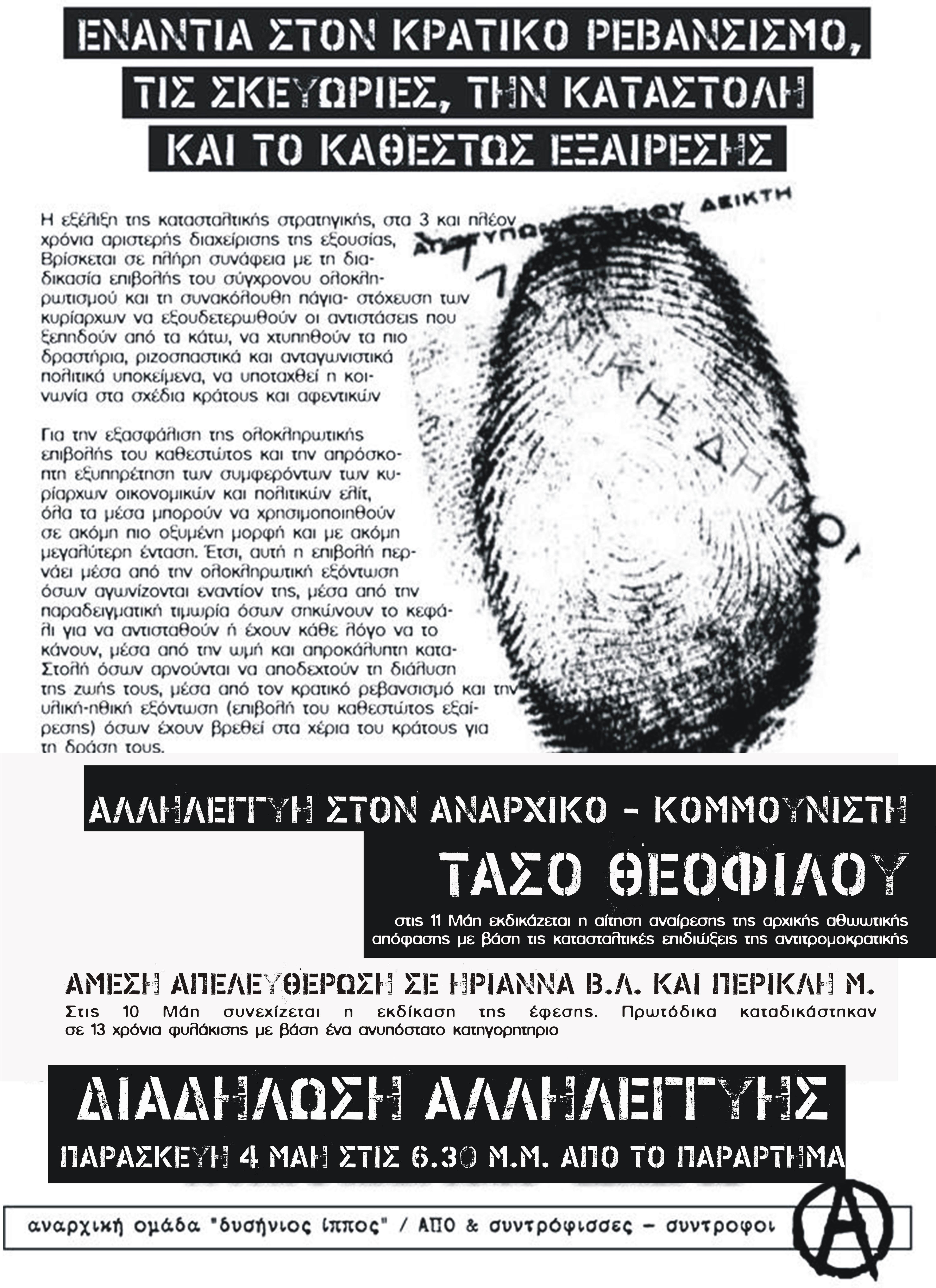 ΑΛΛΗΛΕΓΓΥΗ ΣΤΟΝ ΑΝΑΡΧΙΚΟ – ΚΟΜΜΟΥΝΙΣΤΗ ΤΑΣΟ ΘΕΟΦΙΛΟΥ. ΝΑ ΜΗΝ ΠΕΡΑΣΕΙ ΤΟ ΑΣΤΥΝΟΜΙΚΟΔΙΚΑΣΤΙΚΟ ΠΡΑΞΙΚΟΠΗΜΑ
