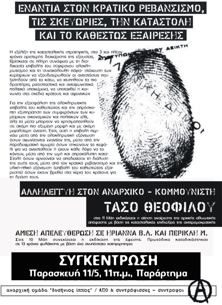 Η συγκυβέρνηση Σύριζα-Ανέλ έχει επιλέξει να ανασύρει και να θέσει σε εφαρμογή την «αριστερή» εκδοχή του δόγματος νόμος και τάξη. Η εκκένωση της κατάληψης Πρυτανείας που πραγματοποιούνταν σε ένδειξη αλληλεγγύης με την απεργία πείνας των πολιτικών κρατουμένων, η εκδικητική άρνηση χορηγησης των αδειών σε πολιτικούς κρατούμενους, η ποινικοποίηση των φιλικών και συγγενικών σχέσεων με αυτούς, η επίθεση σε οποιαδήποτε μορφή συνδικαλισμού (διώξεις μελών του Σωματείου Σερβιτόρων Μαγείρων, στοχοποίηση εργαζομένων στα Μέσα Μαζικής Μεταφοράς, εκδικητικές απολύσεις εργαζομένων για τη δράση τους, κ.α.), οι διώξεις και οι εισβολές σε σπίτια αγωνιστών ενάντια στους πλειστηριασμούς, οι δίκες ολόκληρων χωριών και η μετατροπή τους σε «τρομοκρατικές» οργανώσεις, οι αναίτιες προσαγωγές και συλλήψεις αγωνιστών, τα στημένα κατηγορητήρια και οι πολιτικές σκευωρίες, οι εξοντωτικές ποινές (καταδίκη του 77χρονου αγωνιστή από τη Μεγάλη Παναγιά Χαλκιδικής, η καταδίκη του Μάριου Σεϊσίδη σε 36 χρόνια φυλάκισης, η καταδίκη του Φοίβου Χαρίση χωρίς στοιχεία και η άρνηση για χορήγηση άδειας κ.α), είναι μερικά από τα αποτελέσματα που έχει επιφέρει η αναβάθμιση του κατασταλτικού που σταδιακά εφαρμόζει η κυβέρνηση σε συνεργασία με τις δικαστικές αρχές και την αντιτρομοκρατική υπηρεσία. Στα παραπάνω έρχονται να προστεθούν και οι πρόσφατες υποθέσεις του Β. Δημάκη και του Ν. Γιαγτζόγλου (με το κράτους να προσπαθεί πραγματικά να τους εξοντώσει) καθώς και η νέα μεθόδευση του κράτους με τους “ατομικούς τρομοκράτες’’ όπου επιχειρείται να στηθεί ένα σύγχρονο ιδιώνυμο δημιουργώντας δεδικασμένο για την ποινικοποίηση του φρονήματος.