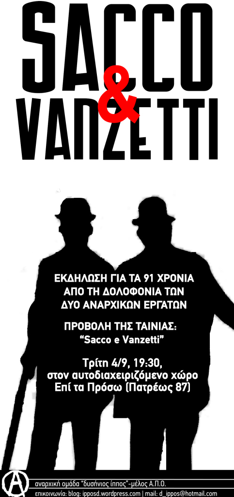 91 χρόνια από τη δολοφονία των αναρχικών Σάκο και Βαντσέτι η μνήμη τους παραμένει ζωντανή στους αγώνες ενάντια στην εργοδοτική ασυδοσία και τρομοκρατία, τον πόλεμο, τον φασισμό, τον ρατσισμό, τον σύγχρονο ολοκληρωτισμό και την κρατική καταστολή.