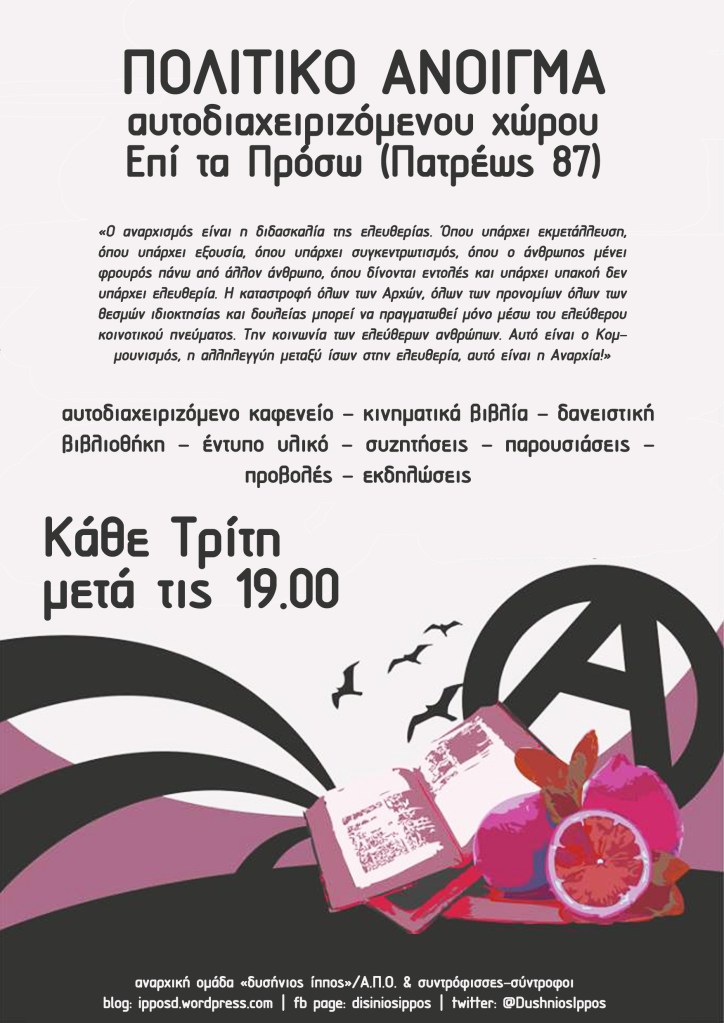 αυτοδιαχειριζόμενο καφενείο – κινηματικά βιβλία – δανειστική βιβλιοθήκη – κινηματικά έντυπα – συζητήσεις – παρουσιάσεις – προβολές – εκδηλώσεις