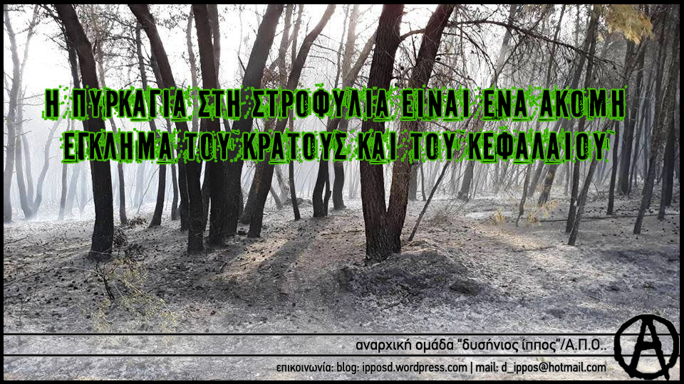 Σε ένα περιβάλλον άγριας ταξικής εκμετάλλευσης και επίθεσης στην κοινωνία και τη φύση, η καταστροφή από τις πυρκαγιές είναι αποτέλεσμα των εγκληματικών πολιτικών του κράτους και του κεφαλαίου, της ίδιας της -δολοφονικής για τον άνθρωπο και καταστροφικής για το φυσικό κόσμο- φύσης του κοινωνικού, πολιτικού και οικονομικού συστήματος που στο όνομα της “ανάπτυξης” και του “κέρδους” δε διστάζει να καταστρέψει ολόκληρα βουνά, λίμνες και ποτάμια για να τα μετατρέψει σε βιομηχανικές ζώνες, να βυθίσει χωριά και να σκορπίσει τον καρκίνο στους ανθρώπους, να μετατρέψει οικισμούς σε σκουπιδότοπους, να λεηλατήσει ακόμα και ολόκληρο το οικοσύστημα. Σε αυτή του τη στρατηγική, οι πυρκαγιές αποτελούν μια πολύ συνήθη πρακτική για την απαξίωση και την καταστροφή του φυσικού περιβάλλοντος ώστε να ακολουθήσει στη συνέχεια η εκμετάλλευση και “αξιοποίηση” του μέσα από εξορύξεις, καζίνο, μεζονέτες, τουρισμό. Πρόκειται για έναν πραγματικό πόλεμο κατά της φύσης και της κοινωνίας, ο οποίος αποτελεί συστατικό στοιχείο του συστήματος.