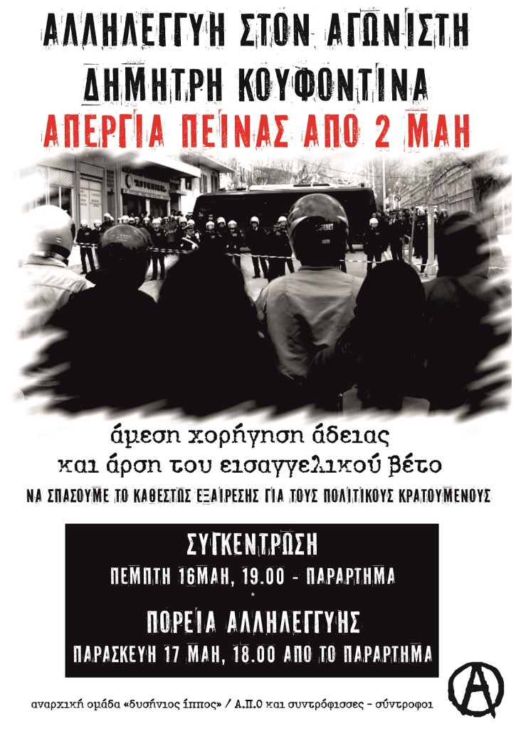 Την Πέμπτη 2 Μαΐου, αφού πραγματοποιήθηκε το συμβούλιο φυλακής στην Κασσαβέτεια του Βόλου ο Δ.Κουφοντίνας ξεκίνησε απεργία πείνας ως απάντηση στο εκδικητικό κόψιμο των αδειών που δικαιούται. Ο εισαγγελέας Κωνσταντίνου έθεσε βέτο στη χορήγηση άδειας στον Δ.Κουφοντίνα, επικαλούμενος όχι τυπικούς, αλλά πολιτικούς λόγους (τη φράση «το κόκκινο νήμα της αντίστασης», που είχε χρησιμοποιήσει ο Δ.Κουφοντίνας σε παλαιότερη δήλωσή του). Αξιοσημείωτο είναι ότι ο συγκεκριμένος εισαγγελέας ήταν απ’ αυτούς που είχαν συμφωνήσει στη χορήγηση άδειας στον Δ.Κουφοντίνα στο παρελθόν, ενώ δεν έχει μεσολαβήσει κάτι από τότε.