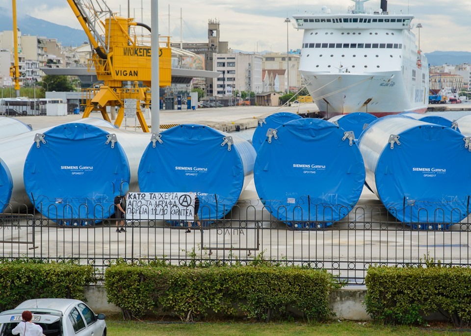 Παρέμβαση στο λιμάνι, όπου φυλάσσονται ανεμογεννήτριες. Κάτω τα χέρια από τα Άγραφα