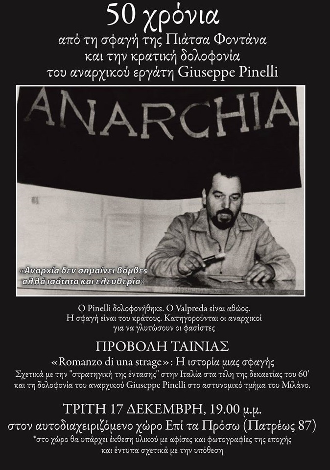 Ο Pinelli δολοφονήθηκε. Ο Valpreda είναι αθώος.Η σφαγή είναι του κράτους. Κατηγορούνται οι αναρχικοί για να γλυτώσουν οι φασίστες…