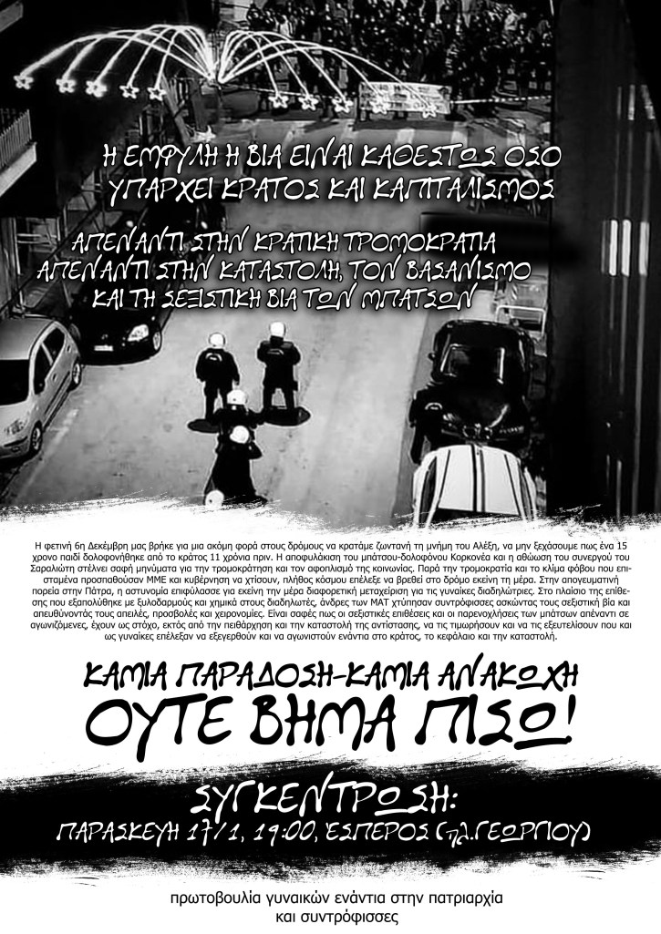 Η φετινή 6η Δεκέμβρη -σε ένα περιβάλλον λυσσαλέας κατασταλτικής επίθεσης του κράτους απέναντι σε όσους και όσες αγωνίζονται- μας βρήκε για μια ακόμη φορά στους δρόμους να κρατάμε ζωντανή τη μνήμη του Αλέξη, να μην ξεχάσουμε πως ένα 15χρονο παιδί δολοφονήθηκε από το κράτος, 11 χρόνια πριν. Η αποφυλάκιση του μπάτσου-δολοφόνου Κορκονέα και η αθώωση του συνεργού του Σαραλιώτη στέλνει σαφή μηνύματα για την τρομοκράτηση και τον αφοπλισμό της κοινωνίας. Παρά την τρομοκρατία και το κλίμα φόβου που επισταμένα προσπαθούσαν ΜΜΕ και κυβέρνηση να χτίσουν, πλήθος κόσμου επέλεξε να βρεθεί στο δρόμο εκείνη τη μέρα. Στην απογευματινή πορεία στην Πάτρα, η αστυνομία επιφύλασσε για εκείνη την μέρα διαφορετική μεταχείριση για τις γυναίκες διαδηλώτριες. Στο πλαίσιο της επίθεσης που εξαπολύθηκε με ξυλοδαρμούς και χημικά στους διαδηλωτές, άνδρες των ΜΑΤ χτύπησαν συντρόφισσες ασκώντας τους σεξιστική βία και απευθύνοντάς τους απειλές, προσβολές και χειρονομίες. Είναι σαφές πως οι σεξιστικές επιθέσεις και οι παρενοχλήσεις των μπάτσων απέναντι σε αγωνιζόμενες, έχουν ως στόχο, εκτός από την πειθάρχηση και την καταστολή της αντίστασης, να τις τιμωρήσουν και να τις εξευτελίσουν που και ως γυναίκες επέλεξαν να εξεγερθούν και να αγωνιστούν ενάντια στο κράτος, το κεφάλαιο και την καταστολή.