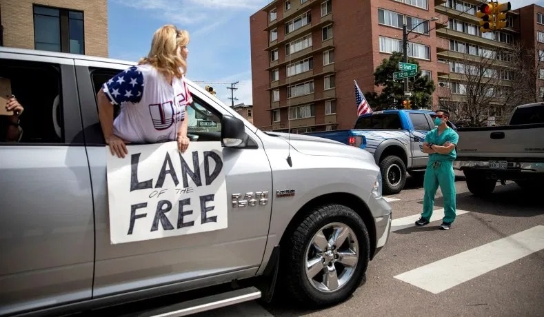 Και αυτές ακόμα οι εξαναγκασμένες κινήσεις περιορισμού της οικονομικής δραστηριότητας, δεν προκύπτουν από κάποιο ξαφνικό ενδιαφέρον για την ανθρώπινη ζωή, ως ενός καθολικού αγαθού. Οι φυλακές και τα στρατόπεδα συγκέντρωσης είναι η μεγαλύτερη απόδειξη ότι η υγεία και η ζωή έχουν σημασία για τα κράτη μόνο στο βαθμό που δεν απειλείται η κοινωνική συνοχή, στον βαθμό δηλαδή που δεν απειλείται η κρατική και καπιταλιστική κυριαρχία. Κυριαρχία η οποία με βεβαιότητα θα απειλούνταν, αλλού περισσότερο και αλλού λιγότερο,καθώς το κράτος το οποίο θέλει να εμφανίζεται ως εγγυητής της κοινωνικής ομαλότητας, με δυσκολία μπορεί να πείσει τους υπηκόους του, τους «νόμιμους πολίτες» του, πως είναι προς το συμφέρον τους να πεθαίνουν μαζικά είτε σε νοσοκομεία υπερπλήρη είτε σε οίκους ευγηρίας είτε και στους δρόμους,προκειμένου να επιβιώσουν οι «πιο δυνατοί» στα πλαίσια της ιδέας της ανοσίας αγέλης. Οι επιμέρους διαφοροποιήσεις στη στάση των κρατών οφείλονται εν πολλοίς και στη δύναμη κυριαρχίας που έχουν ή που θεωρούν πως έχουν επάνω στο κοινωνικό σώμα. Η αυτοπεποίθηση του σουηδικού κράτους, που έχει αφήσει τον ιό να εξαπλώνεται με αποτέλεσμα τους αναλογικά πολλαπλάσιους θανάτους από αυτούς αντίστοιχων πληθυσμιακά και οικονομικά χωρών, οφείλεται στην τεράστια ιδεολογική του κυριαρχία επάνω στη σουηδική κοινωνία. Η διττή στάση του κράτους των ΗΠΑ αποτυπώνεται εύγλωττα στην φωτογραφία που συνοδεύει το άρθρο: Εκεί όπου η πραγματική κρατική και καπιταλιστική βούληση εκφράζεται καθαρά από τους υποστηρικτές του Τραμπ που ορίζουν ως ελευθερία την καπιταλιστική ανάπτυξη και το σημείο όπου αυτή προσκρούει και αναγκάζεται σε οπισθοχώρηση στο μπλόκο του εργαζόμενου νοσοκόμου. Αυτή η αντίθεση διαπερνά κάθε σημείο του πλανήτη, η αντίθεση ανάμεσα στο κρατική και καπιταλιστική επιβολή και στην ανακοπή της από την κοινωνική και ταξική βάση.