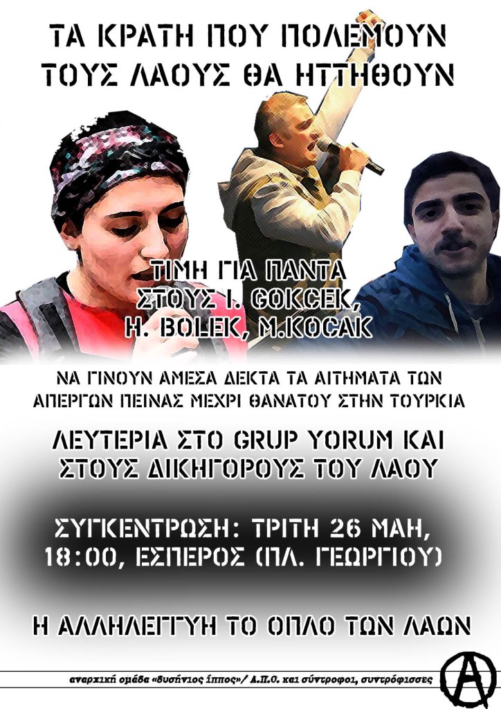 Τιμούμε τη μνήμη της αγωνίστριας Helin Bölek και των αγωνιστών Ibrahim Göckçek και Mustafa Koçak, που δολοφονήθηκαν από το τούρκικο κράτος, μετά από πολύμηνες απεργίες πείνας, αγωνιζόμενοι για τη δικαίωση των αιτημάτων του συγκροτήματος Grup Yorum και την υπεράσπιση των δικαιωμάτων των διωκόμενων αγωνιστών. Απαιτούμε την άμεση δικαίωση των απεργών πείνας μέχρι θανάτου στην Τουρκία. Απαιτούμε την άμεση αποφυλάκιση των 11 συλληφθέντων Τούρκων και Κούρδων αγωνιστών από το ελληνικό κράτος, το οποίο συμβάλλει στις δολοφονικές πολιτικές των υπηρεσιών της Τουρκίας απέναντι στους αγωνιζόμενους. Ενάντια στην κρατική και καπιταλιστική βαρβαρότητα, οι καταπιεσμένοι και εκμεταλλευόμενοι σε κάθε γωνιά του πλανήτη, όλοι όσοι αγωνίζονται, δίνουμε τις μάχες αυτές που θα οικοδομήσουν μια κοινωνία ισότητας, ελευθερίας και αλληλεγγύης, μέχρι τα τραγούδια του αγώνα να ανθίσουν και να γκρεμίσουν τον χρεοκοπημένο κόσμο των κυρίαρχων.
