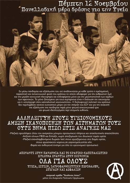 Εν μέσω πανδημίας και εξάπλωσης του ιού αναδεικνύεται με κάθε τρόπο η εγκληματική, παρασιτική και αντικοινωνική φύση του κράτους το οποίο αδιαφορεί για την ανθρώπινη ζωή και την μεγάλη κοινωνική πλειοψηφία και ενδιαφέρεται μόνο για την μεγιστοποίηση των κερδών των αφεντικών. Το μόνο ζητούμενο για τους κυρίαρχους είναι η διάσωση της οικονομίας και η «επιστροφή στην καπιταλιστική κανονικότητα». Η δολοφονική πολιτική του κράτους δεν περιλαμβάνει κανένα ουσιαστικό μέτρο για την στήριξη του ΕΣΥ και για την ανακοπή της εξάπλωσης της πανδημίας παρά μόνο φτωχά επικοινωνιακά τρικ και φτωχά ιδεολογήματα περί ατομικής ευθύνης.