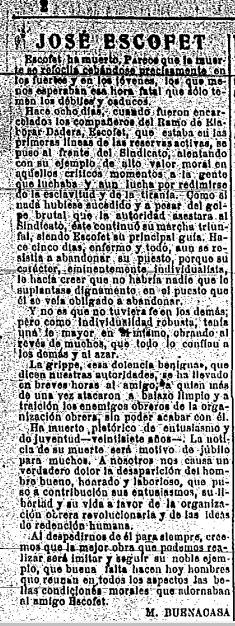 Στο φύλλο της SolidaridadObrera, στις 15 Οκτώβρη του 1918, ο Manuel Buenacasa αναφέρεται στον θάνατο του Jose Escofet από τη γρίπη: