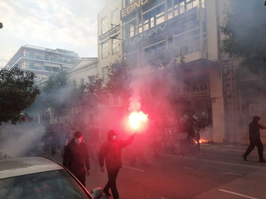 Στο ύψος των δικαστηρίων, σύντροφοι από το ιδιαίτερα μαζικό μπλοκ της ανοιχτής συνέλευσης αλληλεγγύης στον απεργό πείνας Δ. Κουφοντίνα άναψαν καπνογόνα δημιουργώντας δυναμικό παλμό. Εκτός από συνθήματα αλληλεγγύης στον απεργό πείνας Δ. Κουφοντίνα, στην πορεία κυριάρχησαν και συνθήματα ενάντια στην αστυνομική βία και τρομοκρατία εξαιτίας των πρόσφατων περιστατικών δολοφονικών επιθέσεων από μπάτσους.