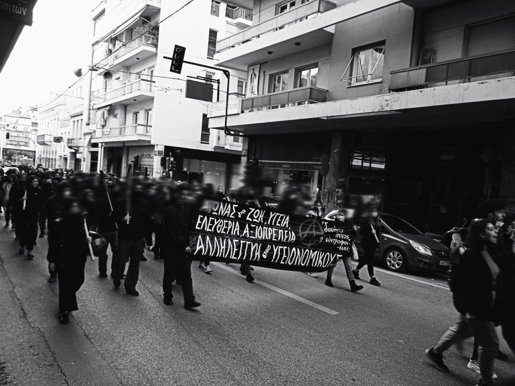 “Ούτε υγεία ούτε ελευθερία τo κράτος σπέρνει θάνατο κ τρομοκρατία”.