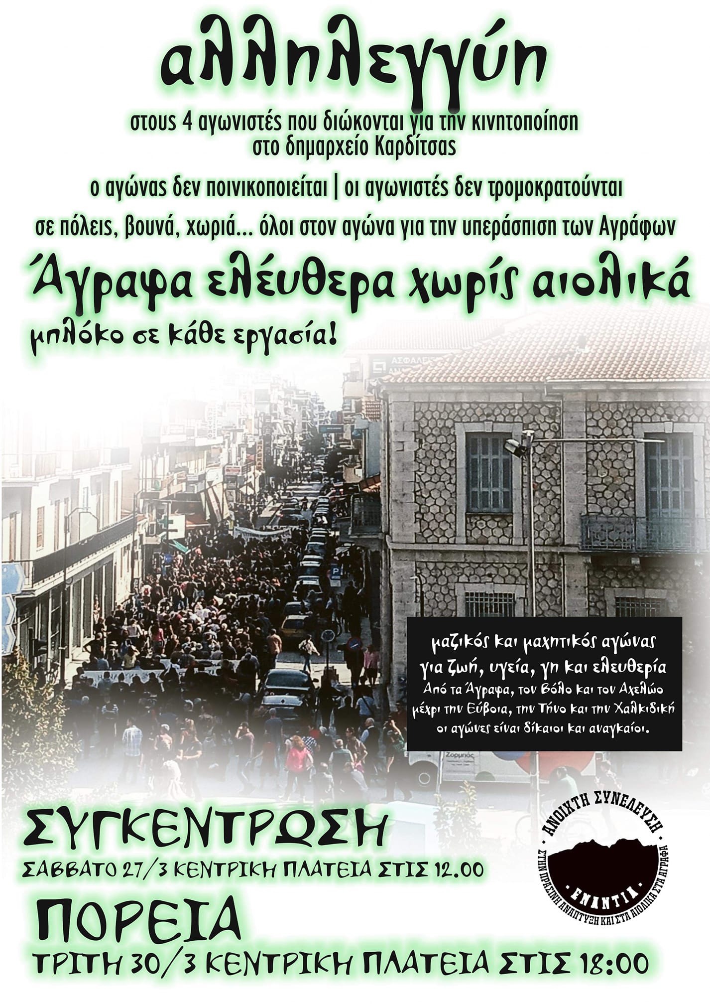 - Την Τρίτη 30/3 στις 18:00 υπάρχει κάλεσμα σε αντικατασταλτική πορεία. Την ίδια μέρα είναι προσδιορισμένη η εκδίκασης της υπόθεσης των 4 αγωνιστών που διώκονται για την κινητοποίηση στο δημαρχείο της πόλης και το μπλοκάρισμα της οικονομικής επιτροπής της 22ας Αυγούστου 2019 η οποία θα επικύρωνε τη δημοπρασία δημοτικών δασικών τεμαχίων στους επενδυτές για τη μεταφορά ρεύματος και την έναρξη εργασιών εγκατάστασης γιγαντιαίων αιολοικών βιομηχανικών μονάδων στα Άγραφα