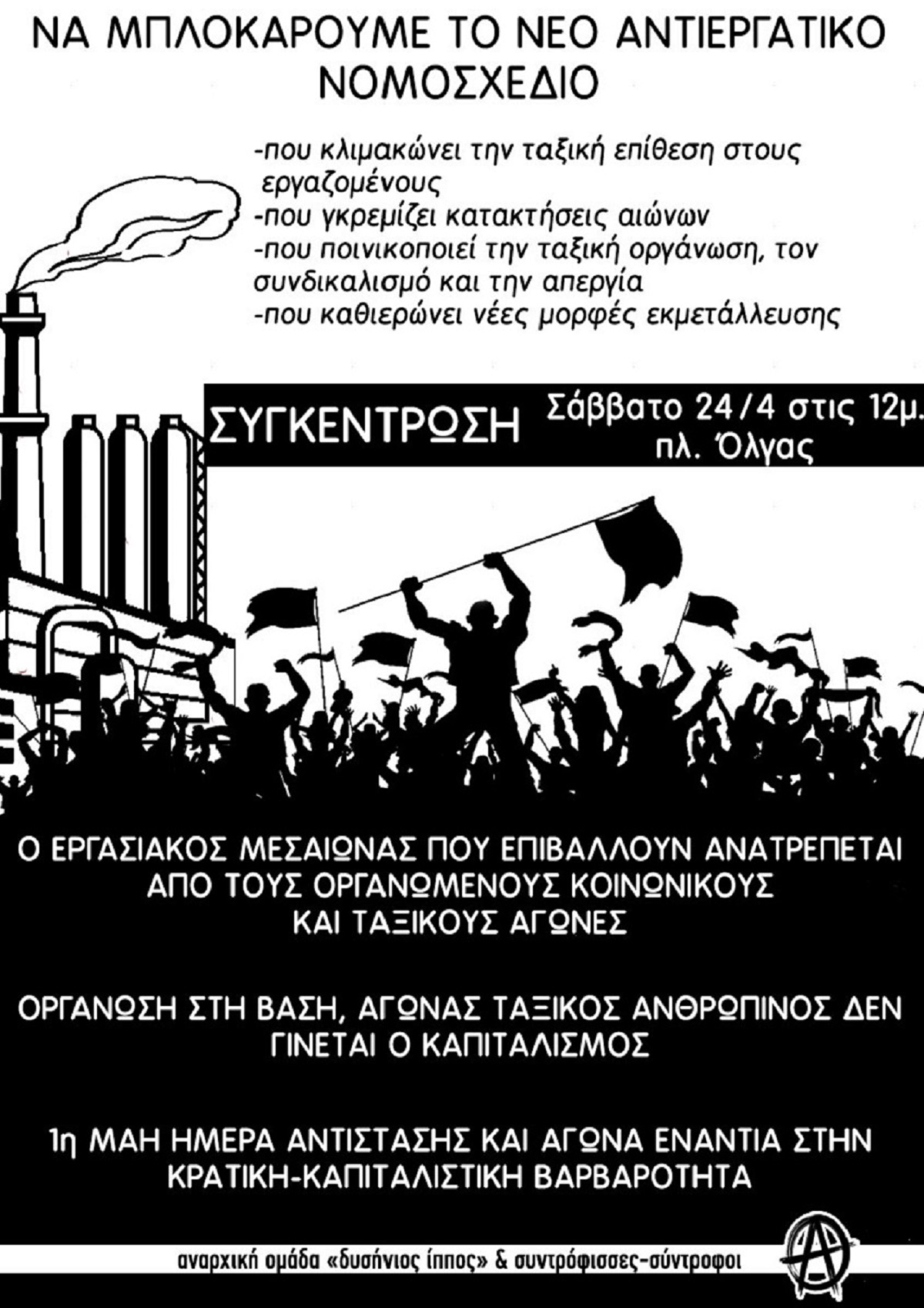 ΣΥΓΚΕΝΤΡΩΣΗ ΕΝΑΝΤΙΑ ΣΤΟ ΝΕΟ ΑΝΤΙΕΡΓΑΤΙΚΟ ΝΟΜΟΣΧΕΔΙΟ, ΣΑΒΒΑΤΟ 24 ΑΠΡΙΛΗ, 12.00, ΠΛ. ΟΛΓΑΣ