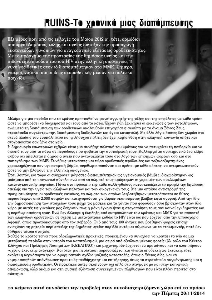 Πριν 9 Απρίληδες το κράτος, σε αγαστή συνεργασία µε τα ΜΜΕ, διαπόµπευσε κάποιες γυναίκες ως οροθετικές ιερόδουλες και ως δηµόσιο κίνδυνο και υγειονοµικήβόµβα για την ελληνική οικογένεια. Αφού τις κυνήγησε στο κέντρο της Αθήνας, αφού τις εξευτέλισε µε αναγκαστικά τεστ και ελέγχους, αφού τις απέκοψε από τις οικογένειες τους, αφού τις διαπόµπευσε στις εφηµερίδες και στις τηλεοράσεις, τις έσυρε στα δικαστήρια ως κατηγορούµενες για βαριά σκοπούµενεςσωµατικές βλάβες.