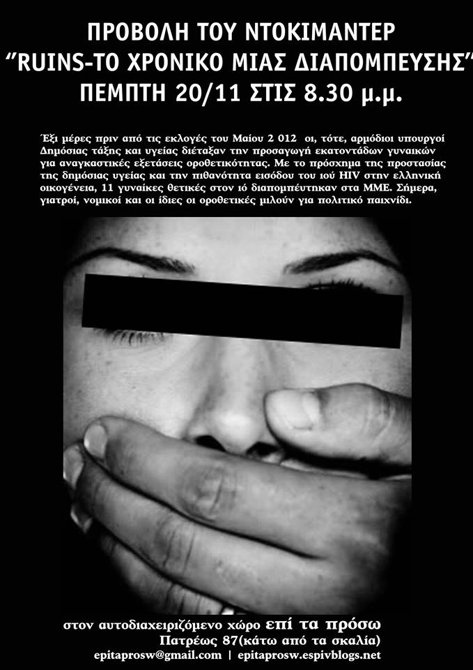Πριν 9 Απρίληδες το κράτος, σε αγαστή συνεργασία µε τα ΜΜΕ, διαπόµπευσε κάποιες γυναίκες ως οροθετικές ιερόδουλες και ως δηµόσιο κίνδυνο και υγειονοµικήβόµβα για την ελληνική οικογένεια. Αφού τις κυνήγησε στο κέντρο της Αθήνας, αφού τις εξευτέλισε µε αναγκαστικά τεστ και ελέγχους, αφού τις απέκοψε από τις οικογένειες τους, αφού τις διαπόµπευσε στις εφηµερίδες και στις τηλεοράσεις, τις έσυρε στα δικαστήρια ως κατηγορούµενες για βαριά σκοπούµενεςσωµατικές βλάβες.