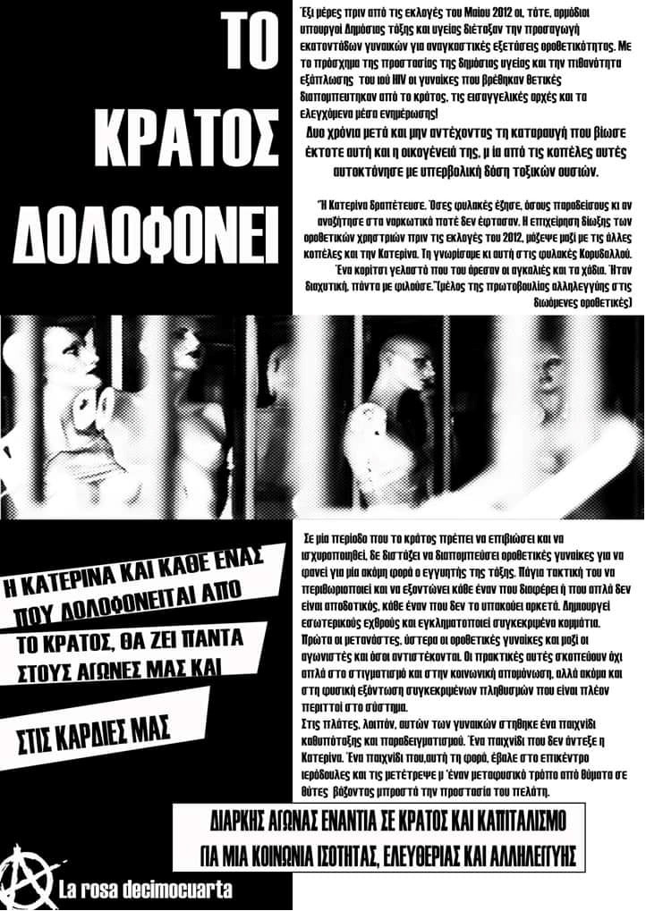 Τον Νοέµβριο του 2014, η Κατερίνα αυτοκτόνησε, και λίγο µετά και ο πατέρας της έκανε απόπειρα αυτοκτονίας. Η Κατερίνα είχε γράψει λίγο νωρίτερα: «Είµαι µια από τις 27 τοξικοεξαρτηµένες οροθετικές γυναίκες που διαποµπευθήκαµε το 2012, µας υποχρέωσαν σε λήψη αίµατος για τεστ HIV/AIDS, και στη συνέχεια µας φυλάκισαν για διάστηµα έως ένα χρόνο, µε την κατηγορία της πορνείας και της «βαριάς σκοπούµενηςσωµατικής βλάβης» στους υποτιθέµενους πελάτες µας.
