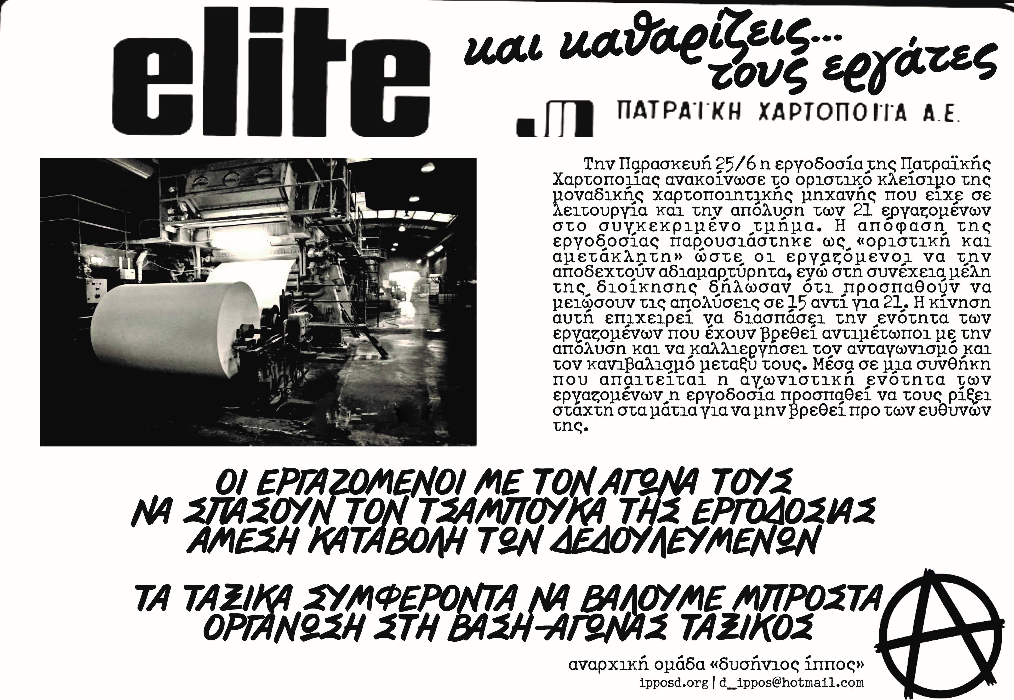 Οι απολύσεις στην ELITE ήρθαν μόλις λίγες εβδομάδες αφότου ψηφίστηκε το κατάπτυστο αντεργατικό νομοσχέδιο της Νέας Δημοκρατίας. Ένα νομοσχέδιο που εντείνει ακόμα περισσότερο την ταξική επίθεση πάνω στον κόσμο της εργασίας, που καταργεί το 8ωρο ανατρέπει κατακτήσεις αιώνων βαμμένες με το αίμα εργατών, που διευρύνει τους όρους της εργασιακής ζούγκλας που βρισκόμαστε αντιμέτωποι, που ποινικοποιεί την συνδικαλιστική δράση και κάθε οργανωτική συγκρότηση των εργαζομένων. Ένα νομοσχέδιο που οφείλουμε να ανατρέψουμε στους δρόμους και στους χώρους εργασίας να λάβουμε κάθε απαραίτητη πρωτοβουλία ώστε να κάνουμε την συνδικαλιστική δράση επικίνδυνη και να βάλουμε τις ανάγκες, τα συμφέροντα και τις διεκδικήσεις μας στο προσκήνιο.