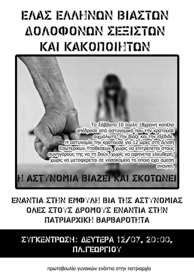 Το Σάββατο 10 Ιούλη 18χρονη κοπέλα, απέδρασε από αστυνομικό που την κρατούσε αιχμάλωτη, την βίαζε και την εξέδιδε. Η κοπέλα βιαζόταν από τα 11 της από τον πατέρα της και στράφηκε στον μπάτσο για να σωθεί. Μόλις κατάφερε να αποδράσει, η αστυνομία αντιστρέφοντας πλήρως την πραγματικότητα την αντιμετώπισε σαν θύτη και όχι σαν θύμα. Την κρατούσε για 12 ώρες στη Δ/νση Εσωτερικών Υποθέσεων, χωρίς να επιτρέπεται στους συνηγόρους της να τη δουν, χωρίς να αφήνεται ελεύθερη, χωρίς να μεταφέρεται στο νοσοκομείο το οποίο είχε άμεση ανάγκη. Δεκάδες κόσμου έσπευσαν να σταθούν στο πλευρό της κοπέλας έξω από το Α.Τ. Ηλιούπολης και να ανοίξει το ζήτημα στα μέσα κοινωνικής δικτύωσης. Έτσι, το περιστατικό μαθεύτηκε ευρέως αντί της συγκάλυψης που επιχειρήθηκε από μπάτσους και ΜΜΕ αρχικά.